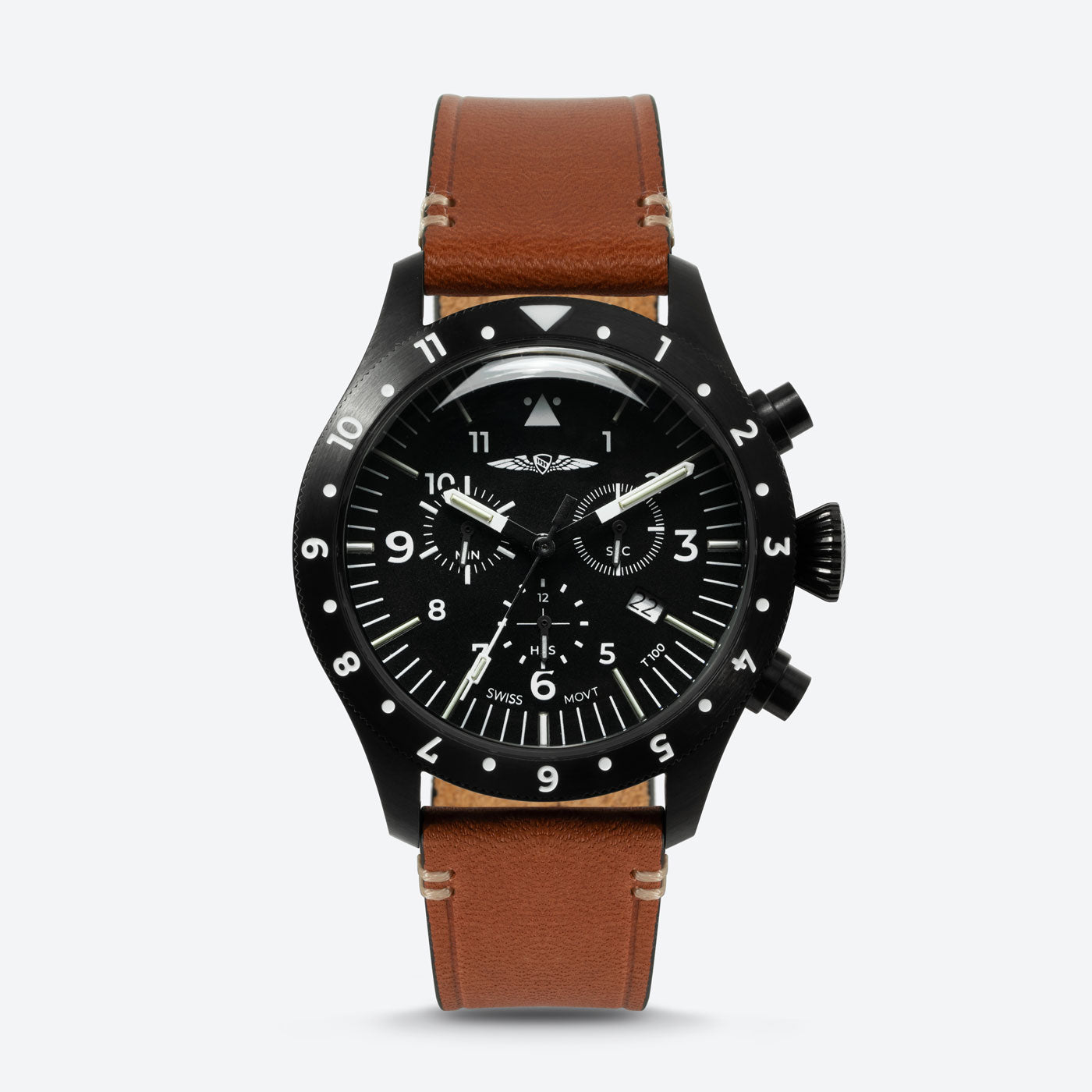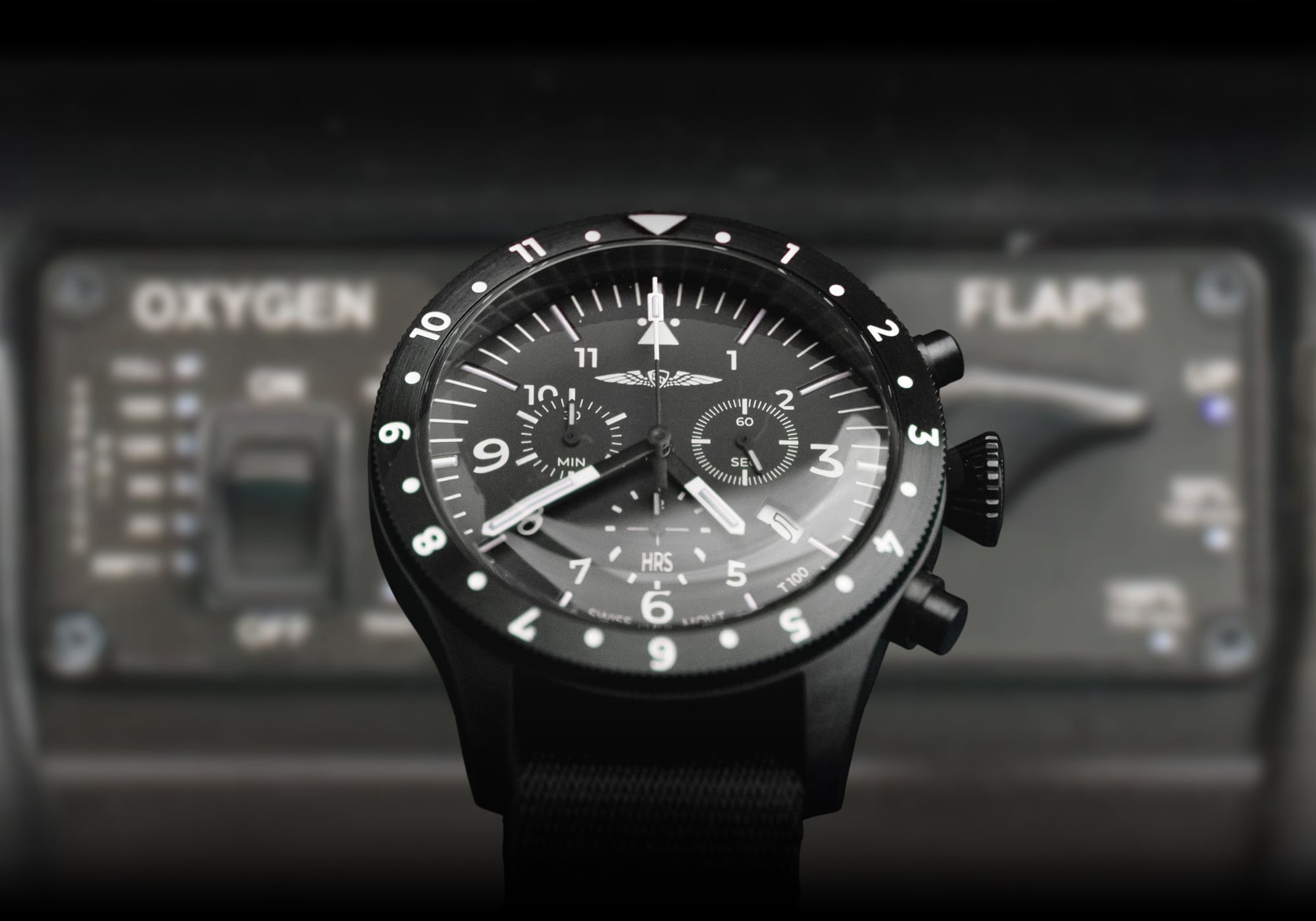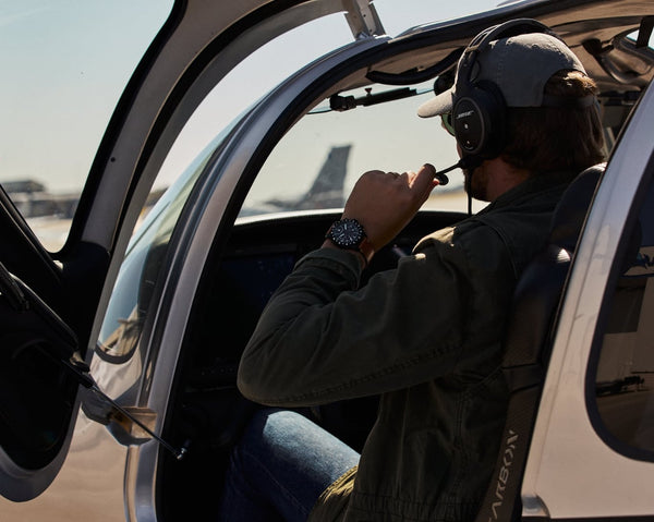 Equipped with a Ronda Caliber 5030.D chronograph movement, this watch is the perfect tool for tracking total flight time or orienteering. The Swiss quartz movement can track elapsed time up to 12 hours.