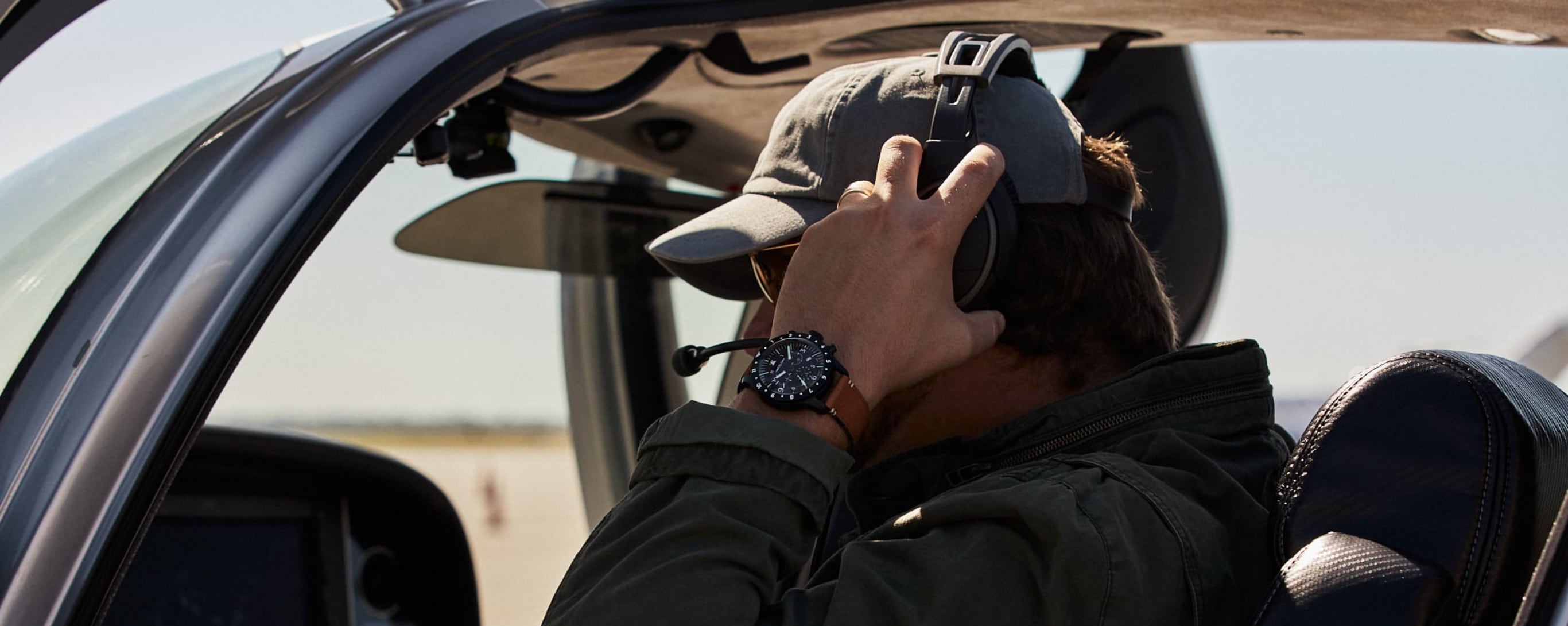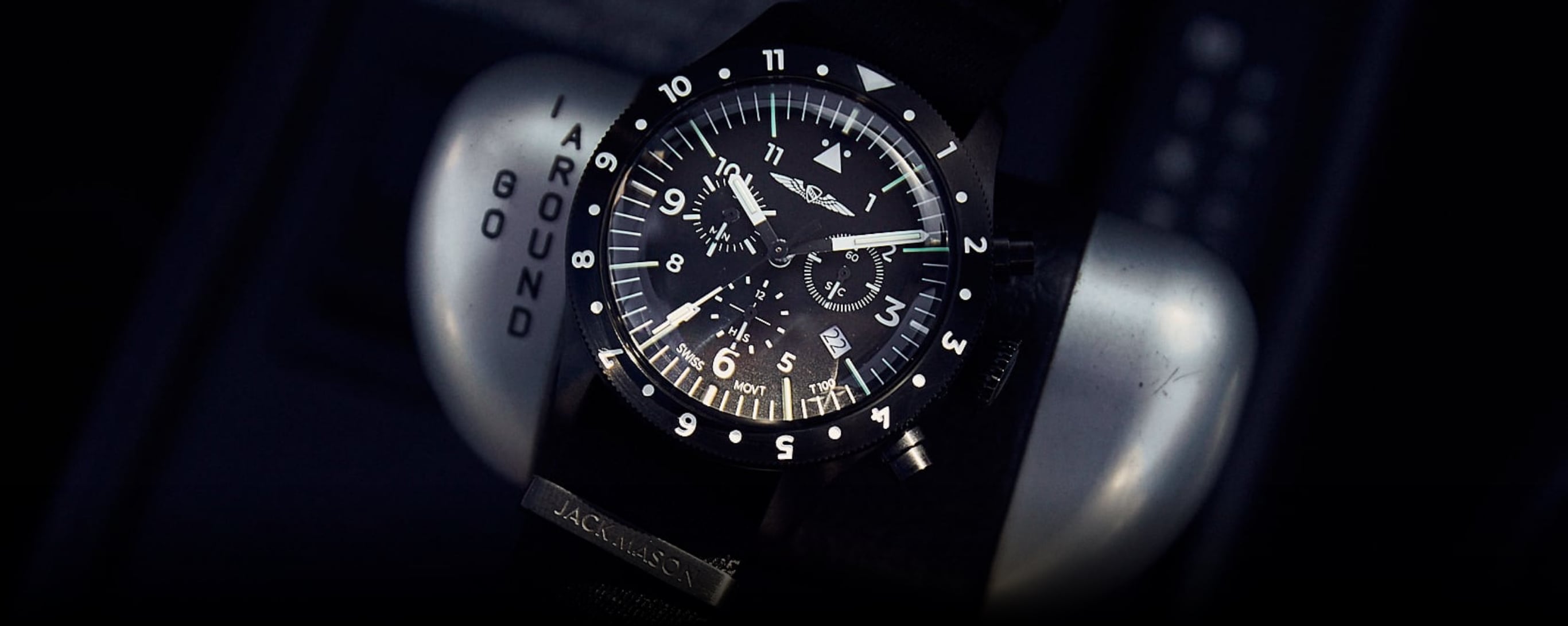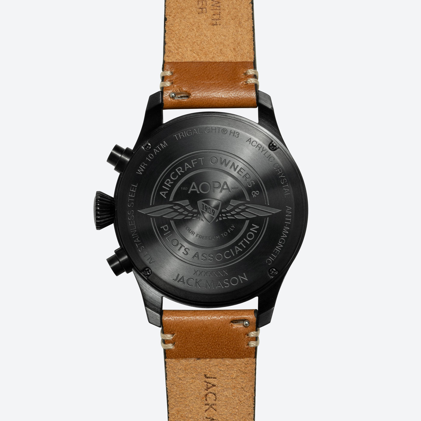 The AOPA Pilot's Chronograph is the perfect collaboration between Jack Mason's passion for watchmaking and AOPA's passion for the skies. For the first time ever, we introduce tritium markers and hands so the dial always stays lit inside a dark cockpit. The case is sized at 45mm and coated with a PVD process for maximum durability and wear resistance. We outfitted the watch with a Swiss Ronda Caliber 5030.D chronograph movement that's protected by an anti-magnetic movement guard; essential for cockpit use. The crystal is made of acrylic to allow flexibility during pressure and altitude changes during flight. The AOPA Pilot's Chronograph is tested for water resistance of up to 100 meters.