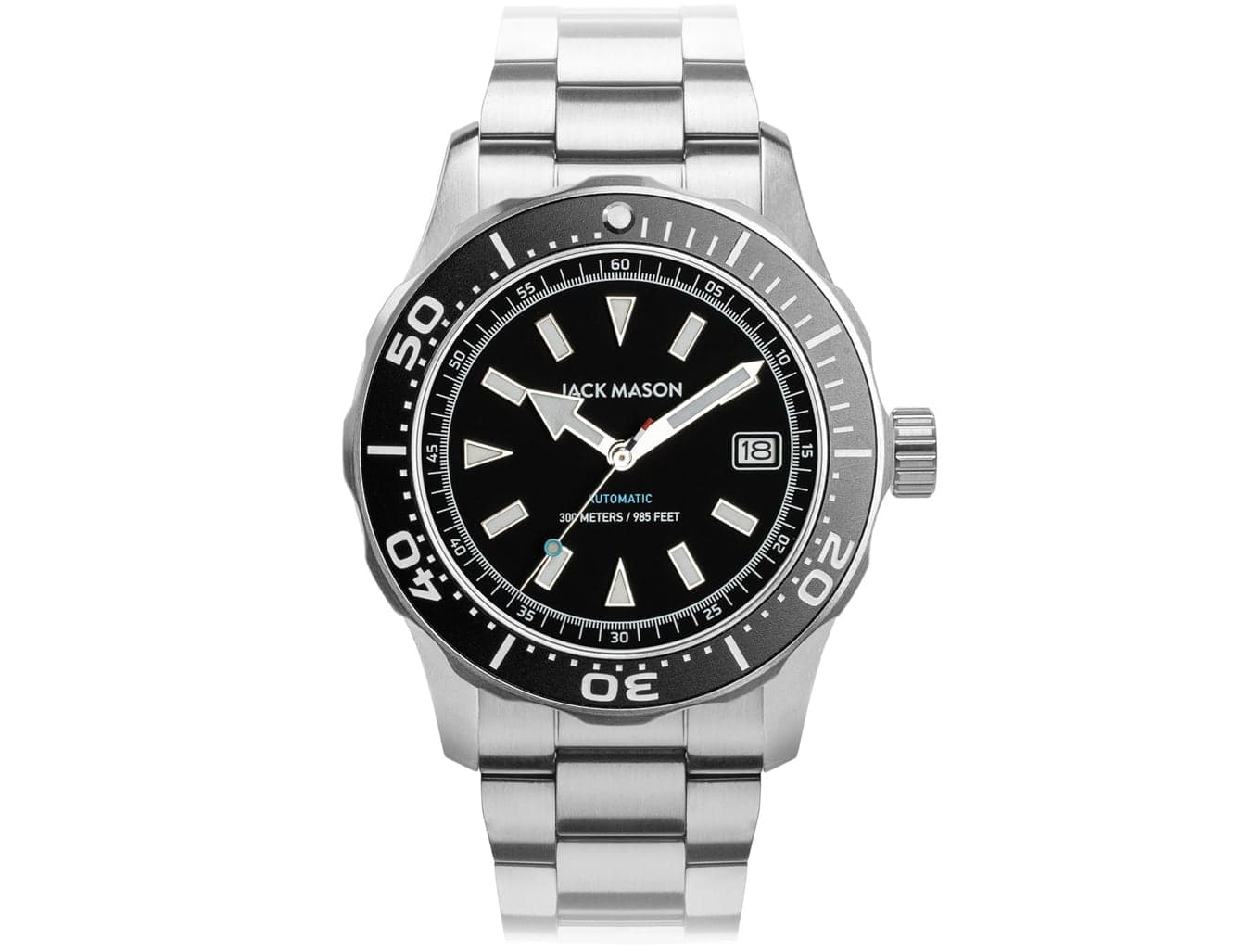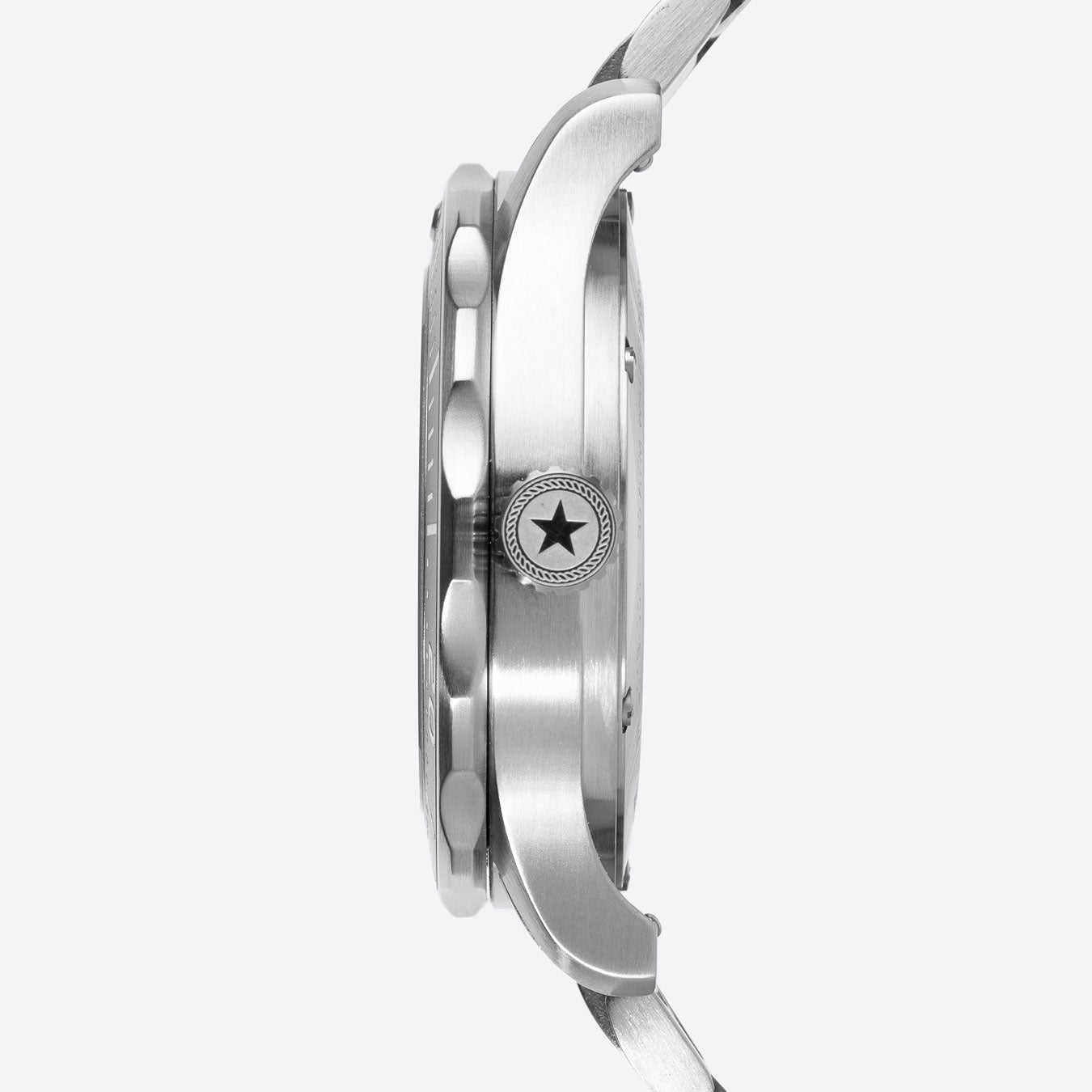 When it comes to a feature-rich diver watch, the Seatrek Automatic box set has it all. The 316L stainless steel case, featuring a screw-down crown and sapphire crystal, is assembled and tested for water-resistance of up to 300 meters. The movement is a Seiko (SII) Caliber NH35A which houses 24 jewels and has a power reserve of 41 hours. The matte black dial features dual-colored Swiss Super-Luminova®️ markings for high legibility. The same luminescence is also featured on the anodized aluminum 120 click uni-directional bezel with colors that correlate back to the hands. The tapered stainless steel bracelet is fitted with quick release pins and also features a diver’s extension in the clasp. The Seatrek Automatic box set comes with a free rubber strap.