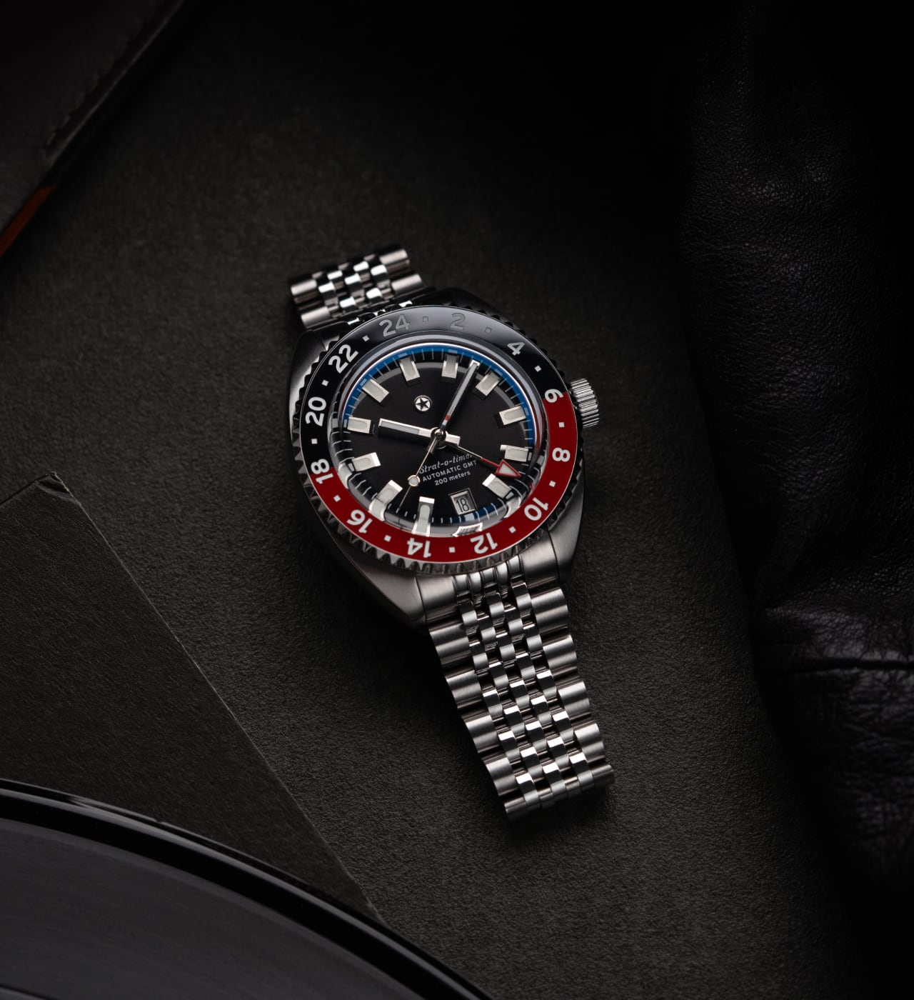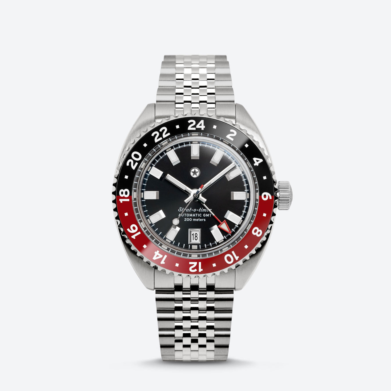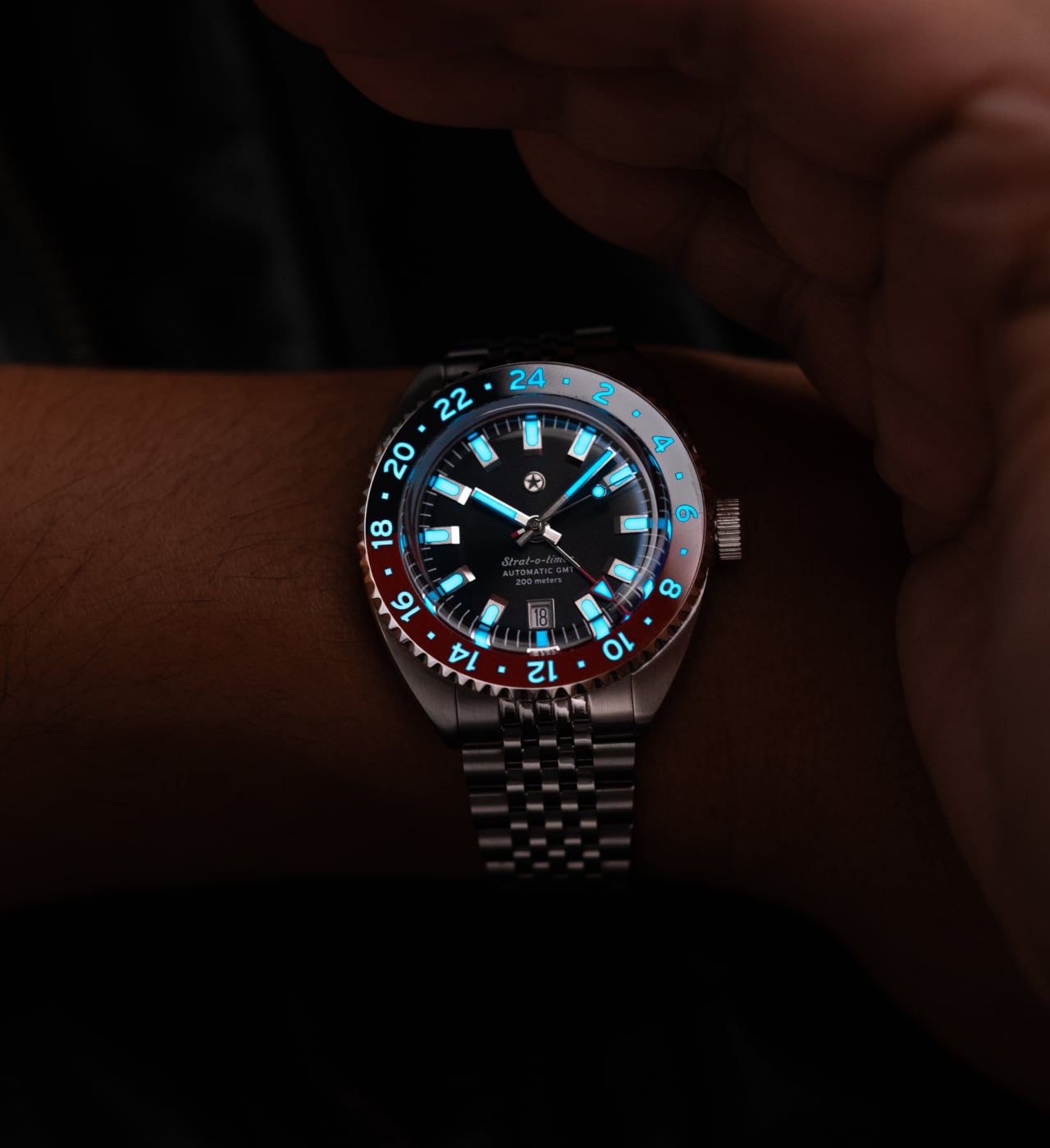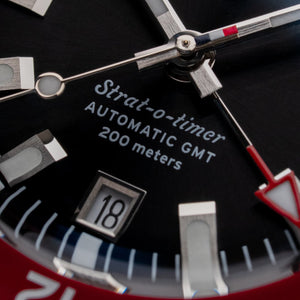 The Strat-o-timer GMT celebrates one of the most iconic watches in history. Housing the Miyota 9075 automatic GMT movement, the Strat-o-timer features jump hour hand making it a traveler's GMT. The bezel features a two-piece ceramic construction that includes two separate colors, making this an engineering feat. With a vision of becoming a legacy brand in our home state of Texas, the Strat-o-timer is assembled, and the movement regulated, in the USA.