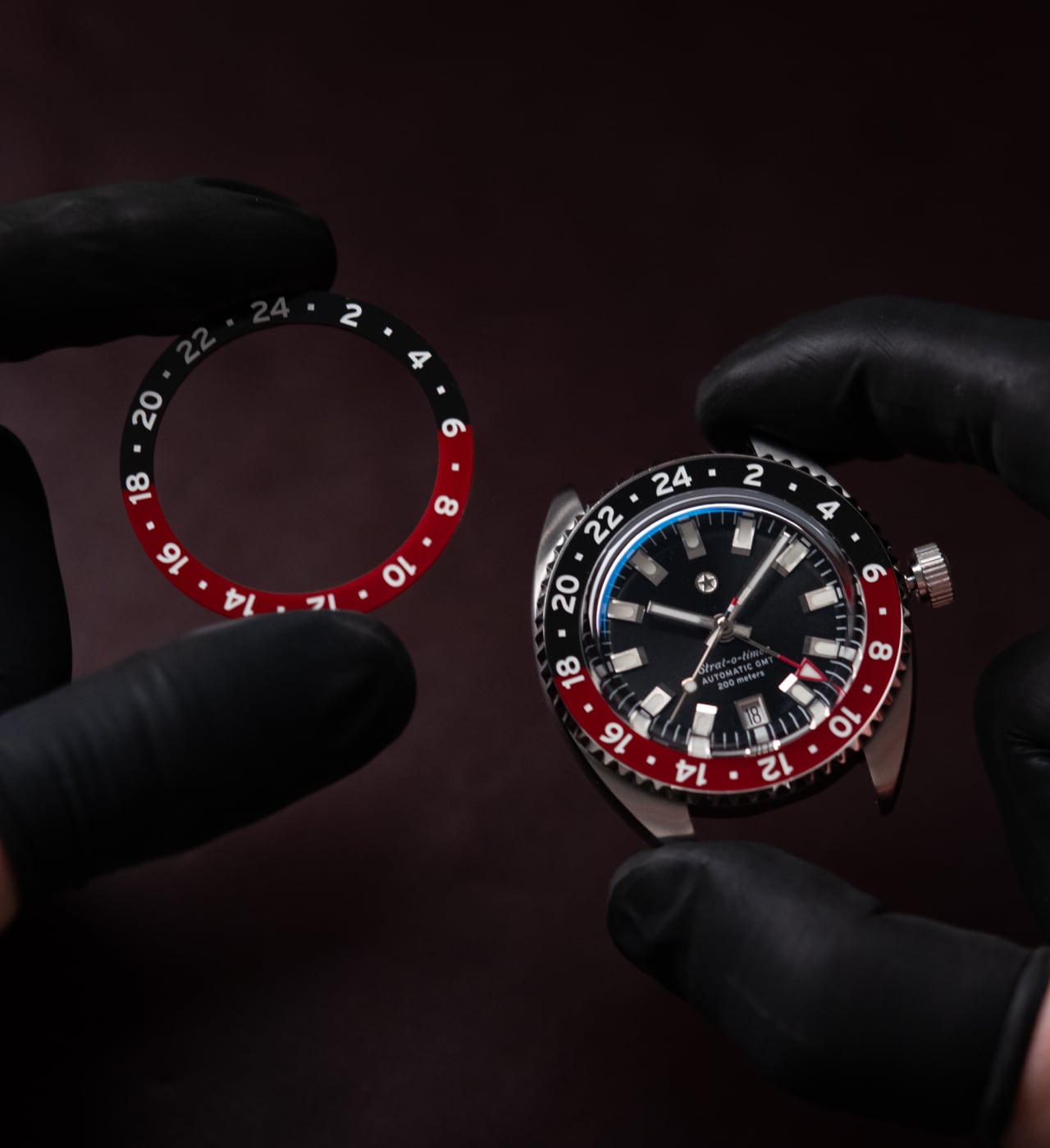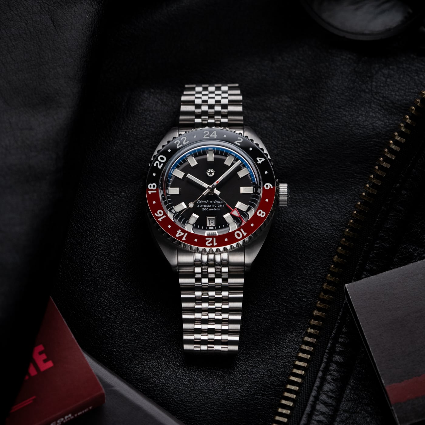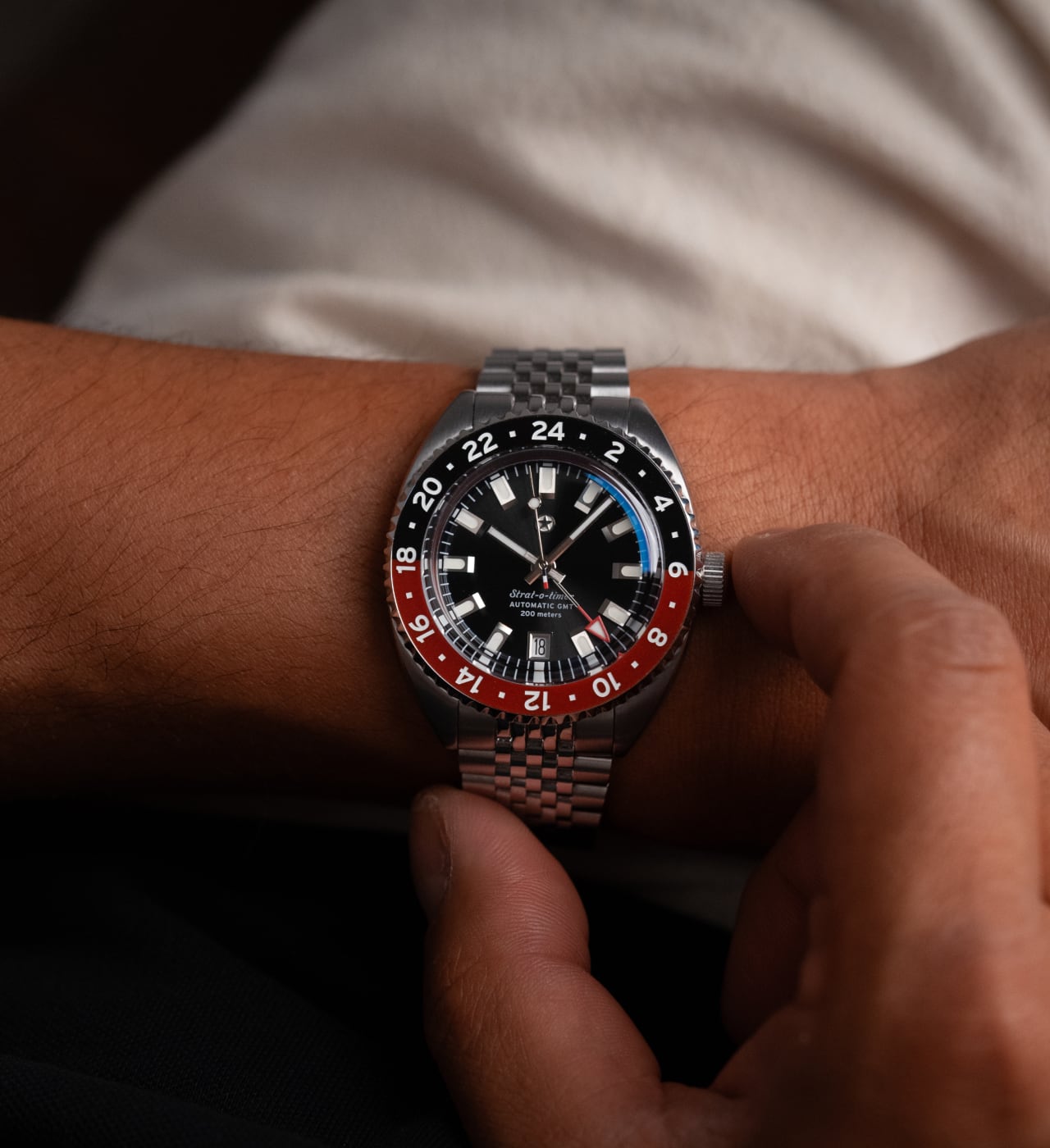 The Strat-o-timer GMT celebrates one of the most iconic watches in history. Housing the Miyota 9075 automatic GMT movement, the Strat-o-timer features jump hour hand making it a traveler's GMT. The bezel features a two-piece ceramic construction that includes two separate colors, making this an engineering feat. With a vision of becoming a legacy brand in our home state of Texas, the Strat-o-timer is assembled, and the movement regulated, in the USA.
