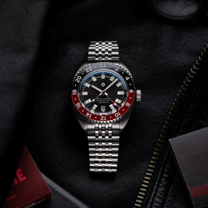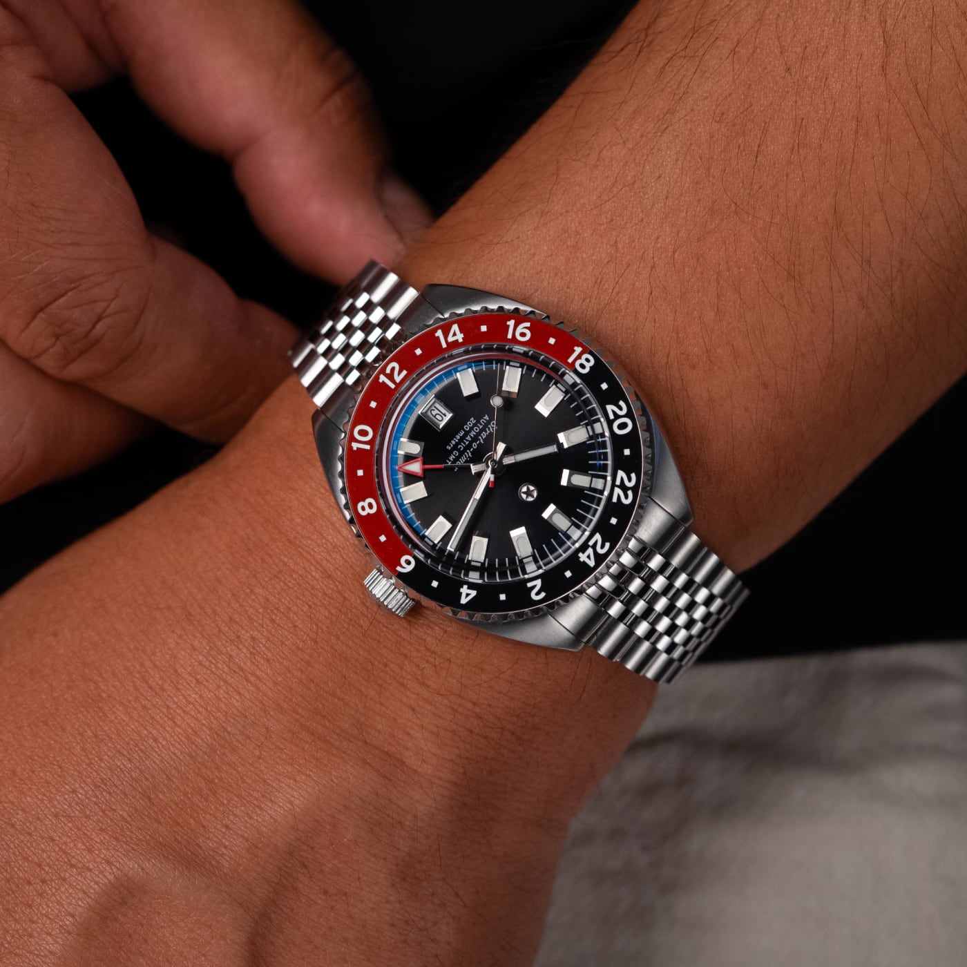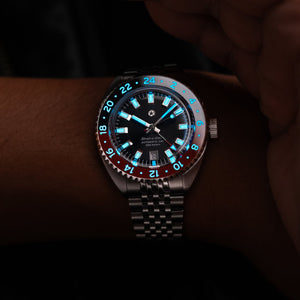 The mechanical, self-winding Miyota 9075 movement allows for accurately tracking two different timezones simultaneously. The traveler GMT functionality grants the ability to adjust the local time via the crown without affecting the 24 hour hand or stopping the watch. Every movement is regulated in-house to maintain an accuracy tolerance of +/-5 seconds per day.