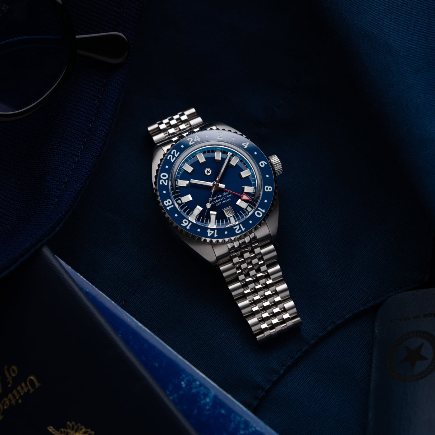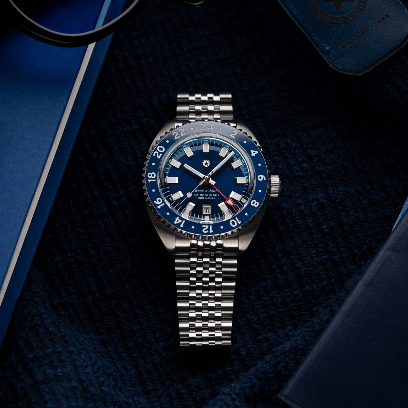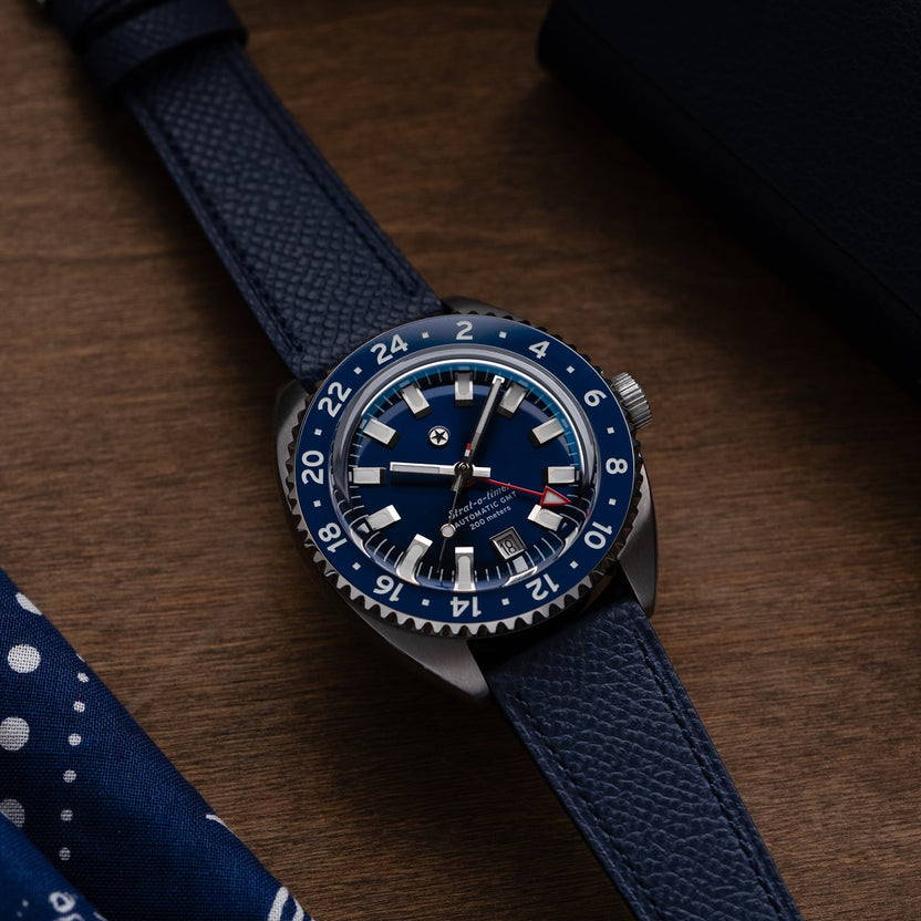 The Strat-o-timer GMT celebrates one of the most iconic watches in history. Housing the Miyota 9075 automatic GMT movement, the Strat-o-timer features jump hour hand making it a traveler's GMT. The bezel features a ceramic insert with Superluminova markings. With a vision of becoming a legacy brand in our home state of Texas, the Strat-o-timer is assembled, and the movement regulated, in the USA.