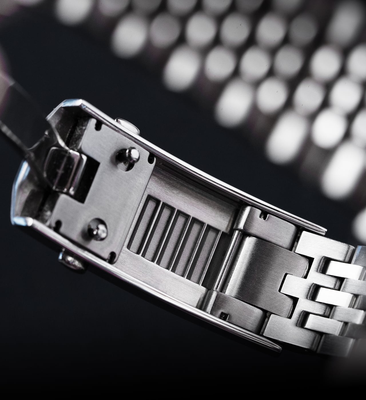 The 316L stainless steel bracelet features a concealed, tool-free system for on-the-go micro-adjustments. The clasp has been carefully engineered with 9 levels of fine-tuning to ensure the perfect fit on a broad spectrum of wrist sizes. While being worn, all the clasp’s mechanics stay hidden out of view to preserve the bracelet’s refined and uniform look.