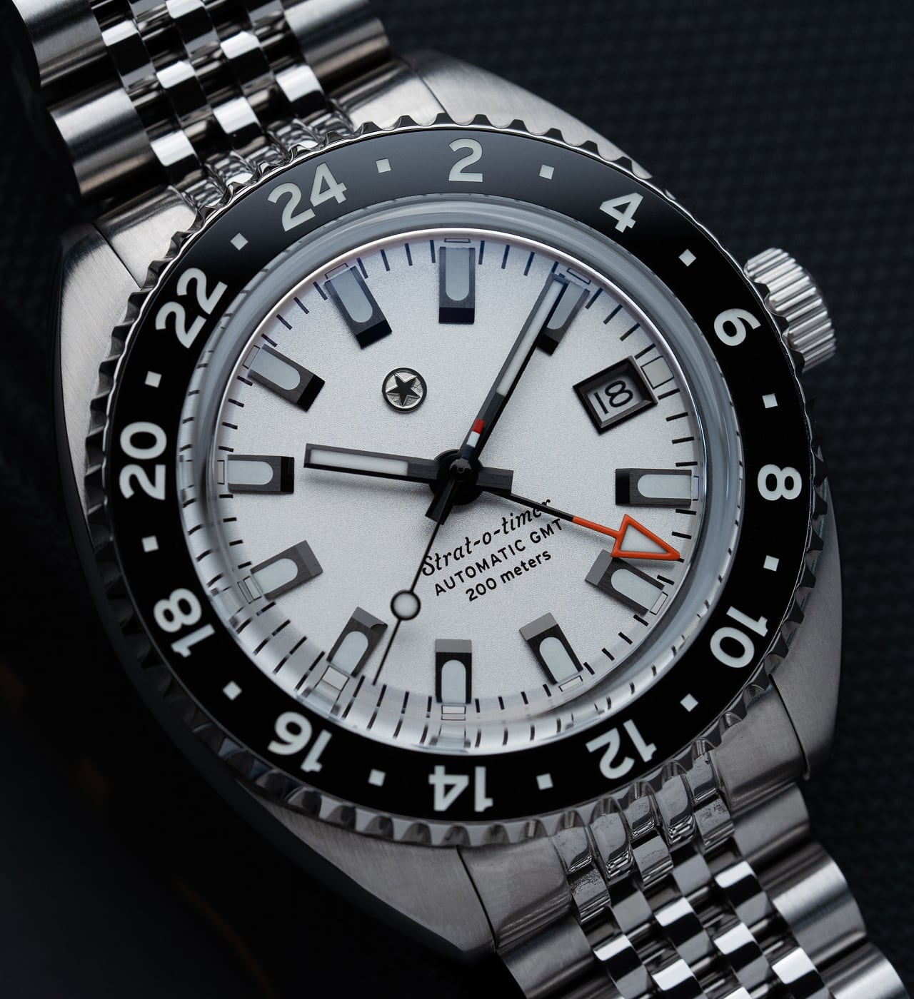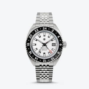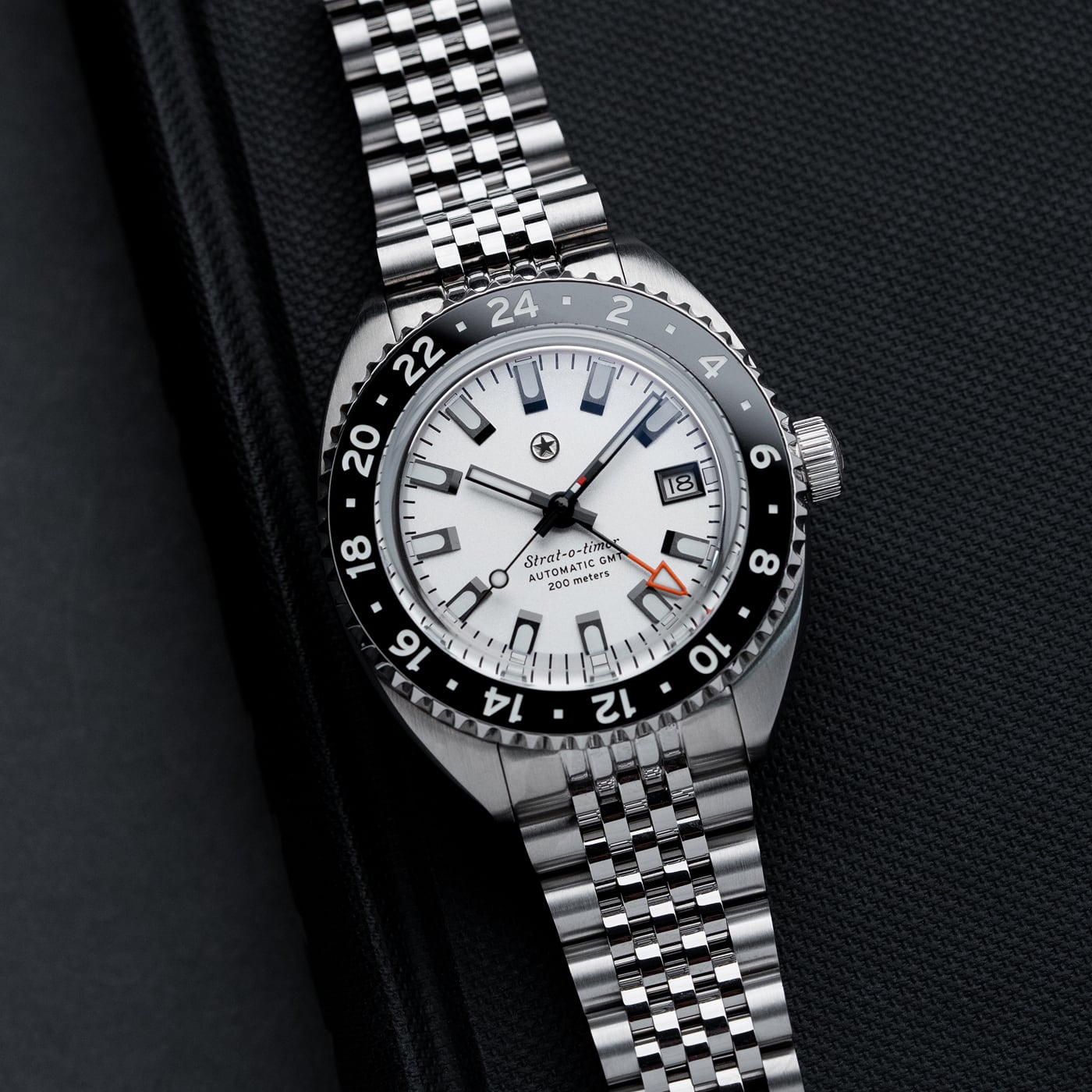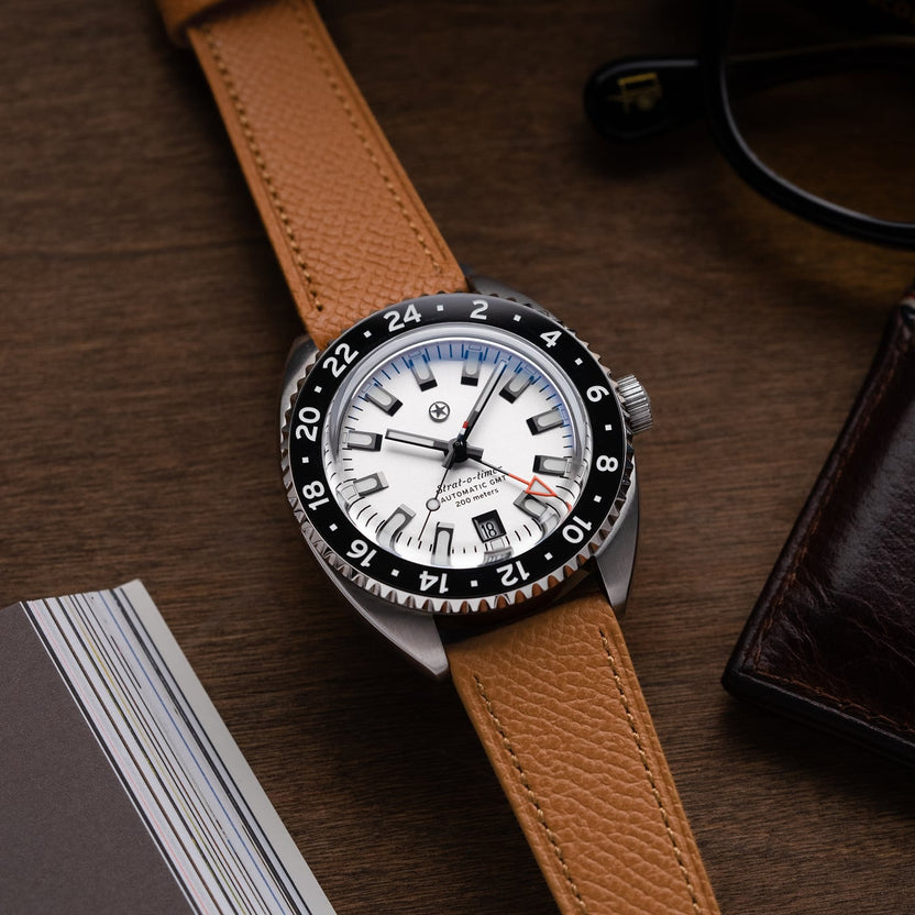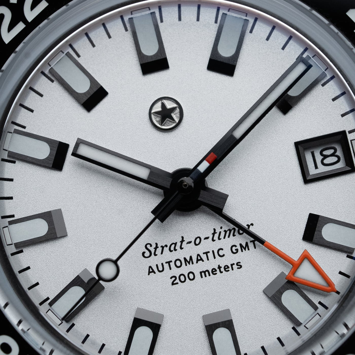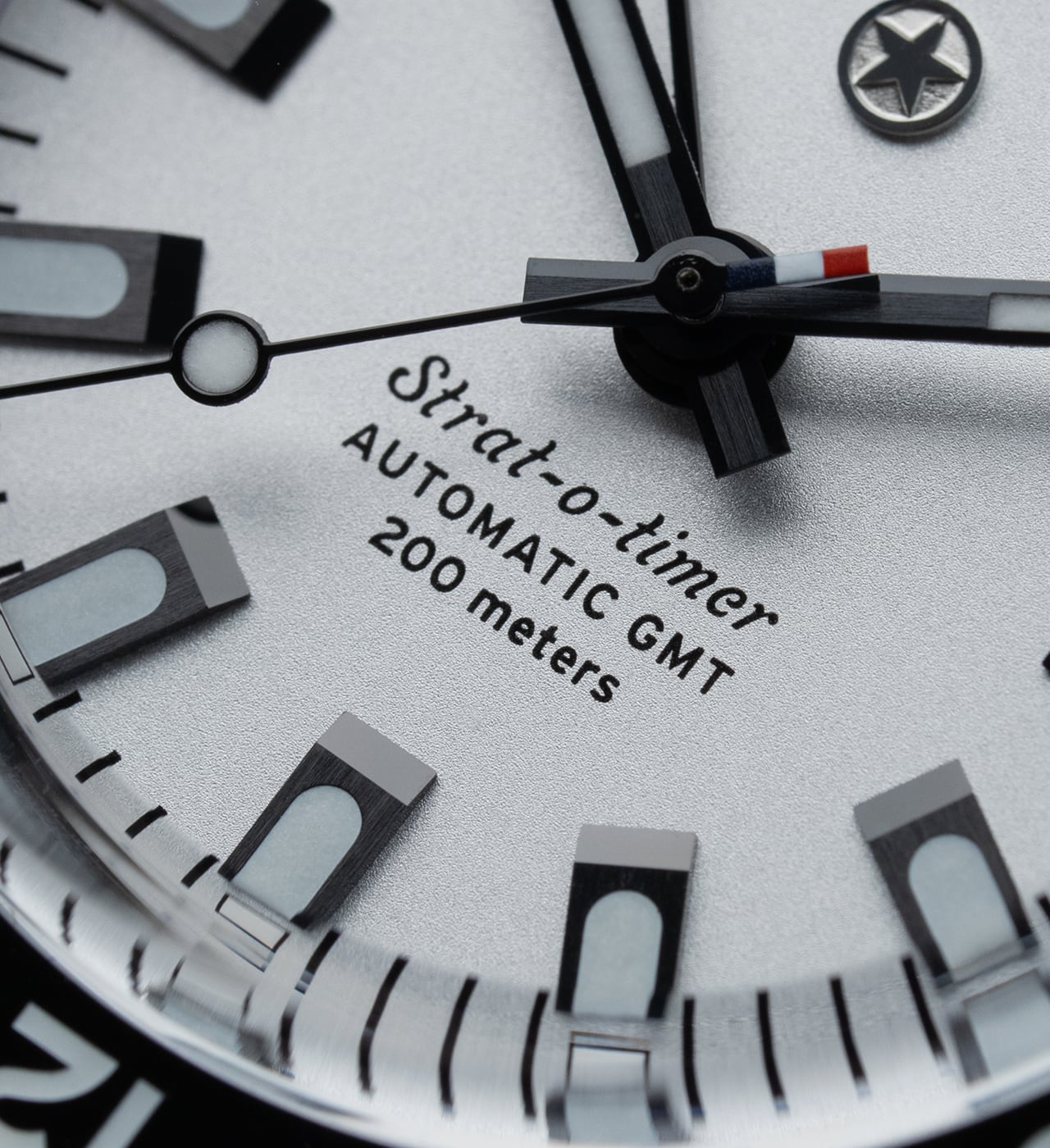 The Strat-o-timer GMT celebrates one of the most iconic watches in history. Housing the Miyota 9075 automatic GMT movement, the Strat-o-timer marks the beginning of a new era of GMTs that features a jumping local hour hand. The bezel features a ceramic insert with Superluminova markings. With a vision of becoming a legacy brand in our home state of Texas, the Strat-o-timer is assembled, and the movement regulated, in the USA.