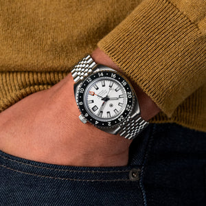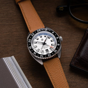 The mechanical, self-winding Miyota 9075 movement allows for accurately tracking two different timezones simultaneously. The traveler GMT functionality grants the ability to adjust the local time via the crown without affecting the 24 hour hand or stopping the watch. Every movement is regulated in-house to maintain an accuracy tolerance of +/-5 seconds per day.