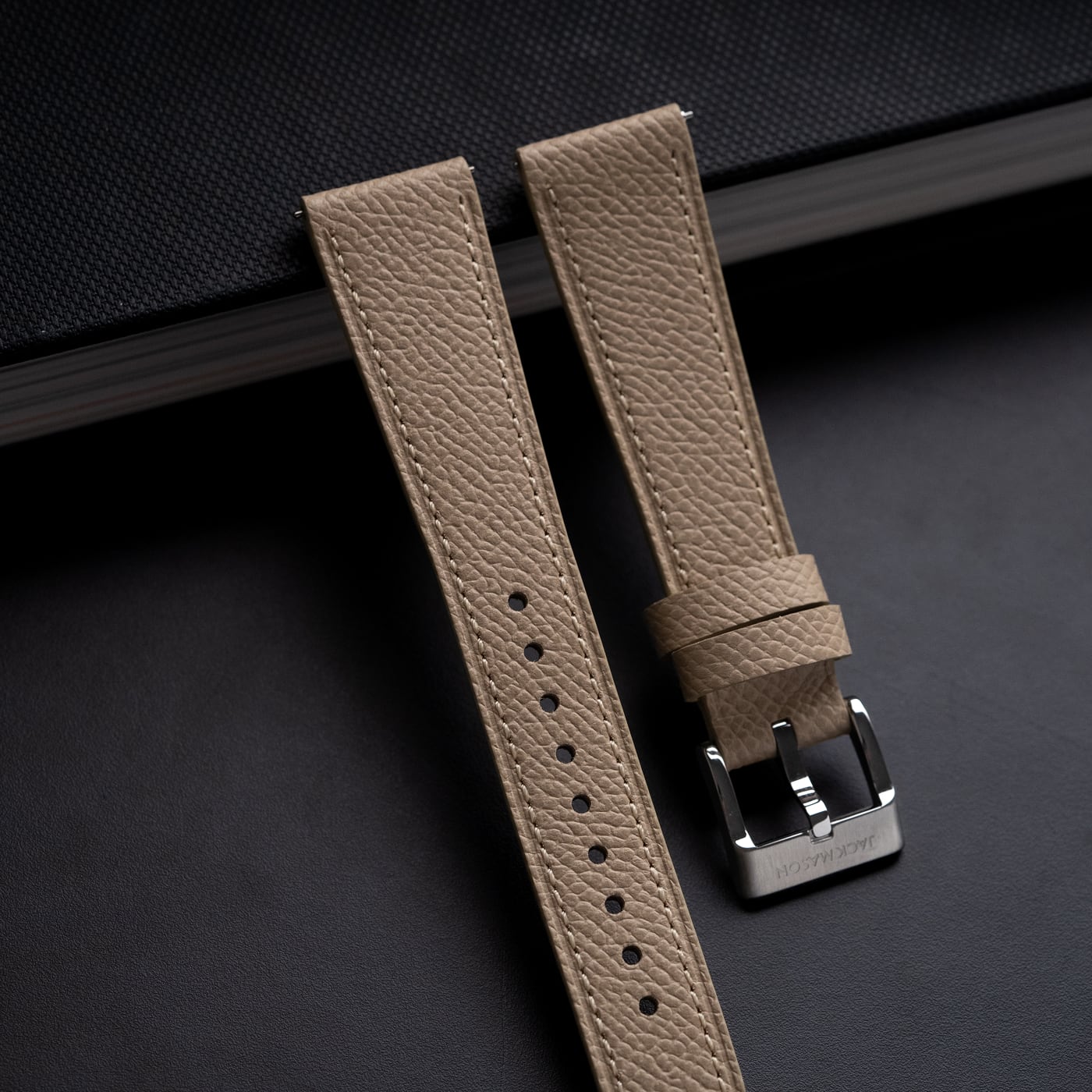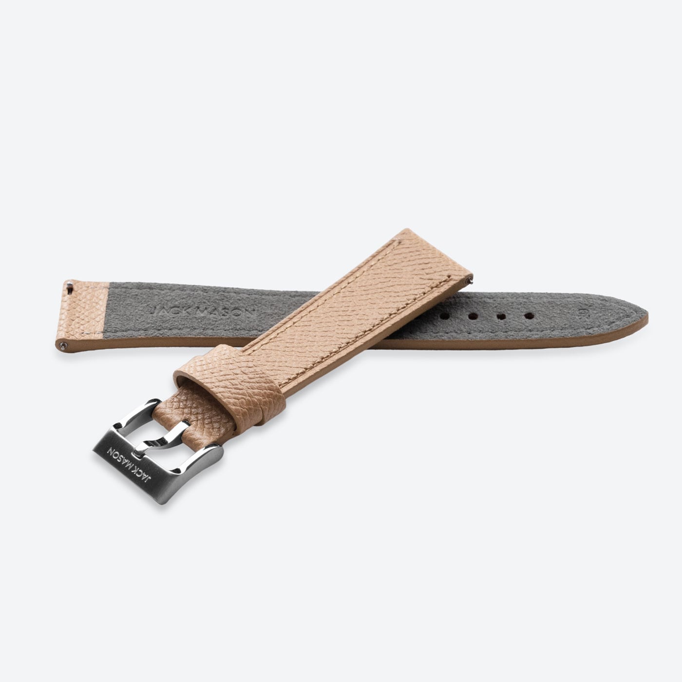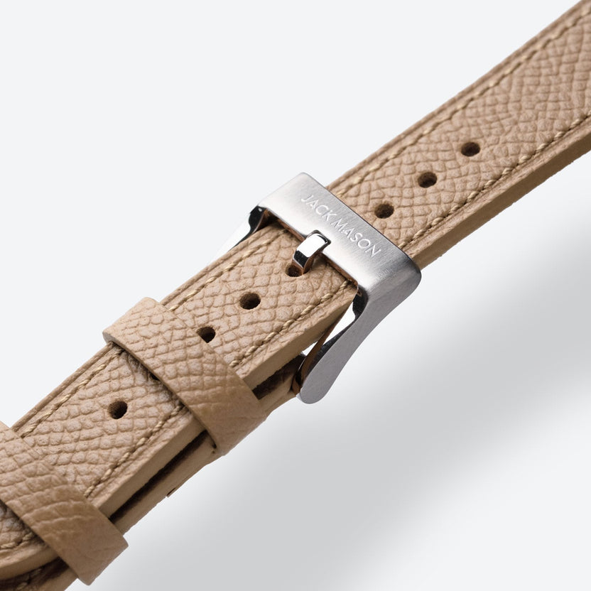 Leather straps are an excellent way in enhancing the look of your watch to match your own unique style. Utilizing Epsom leather from European tanneries ensures the quality is on par with the most high end luxury leather goods. The flat construction with a soft filler guarantees no break in period and makes it easy to wear out of the box. With considered stitch length and gauge combined with a refined heat crease along the perimeter, every detail has been thought through. Jack Mason straps feature an alcantara lining which acts as a natural moisture wicking material and feels great against the skin. The straps taper from 20mm to 16mm.