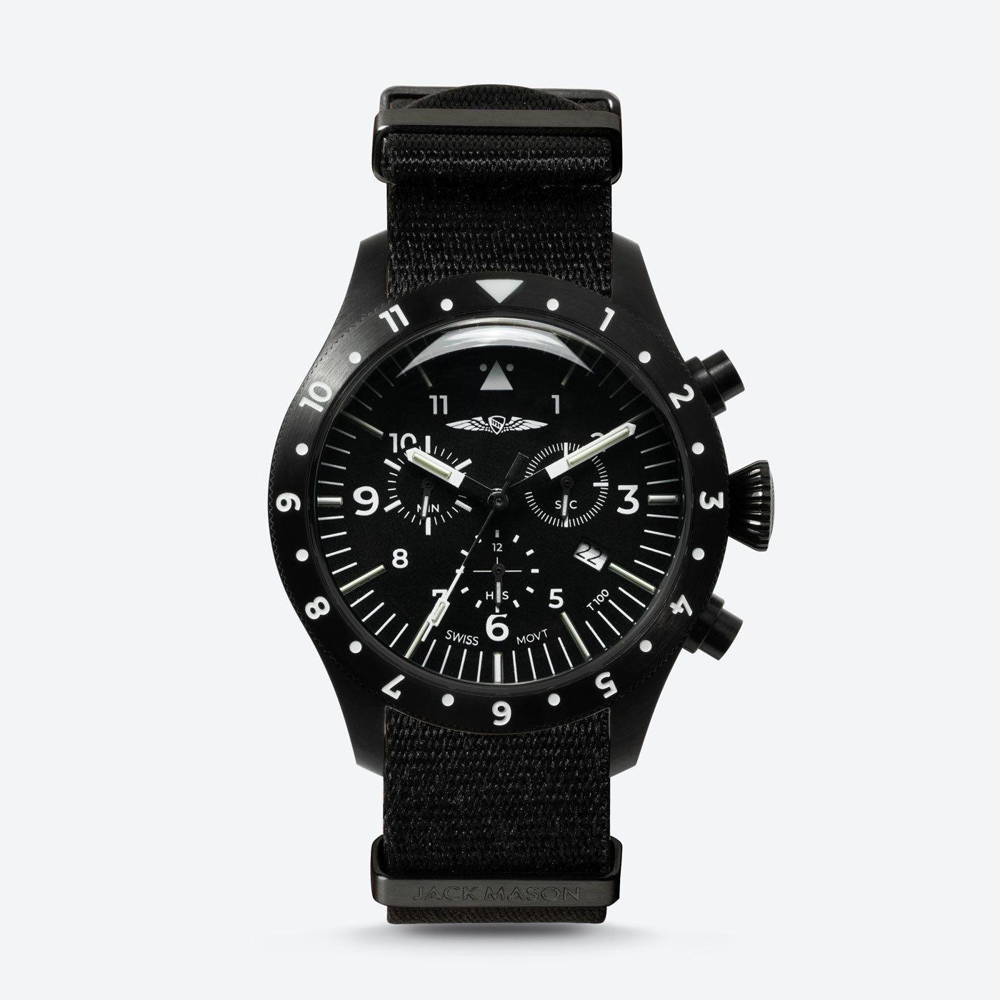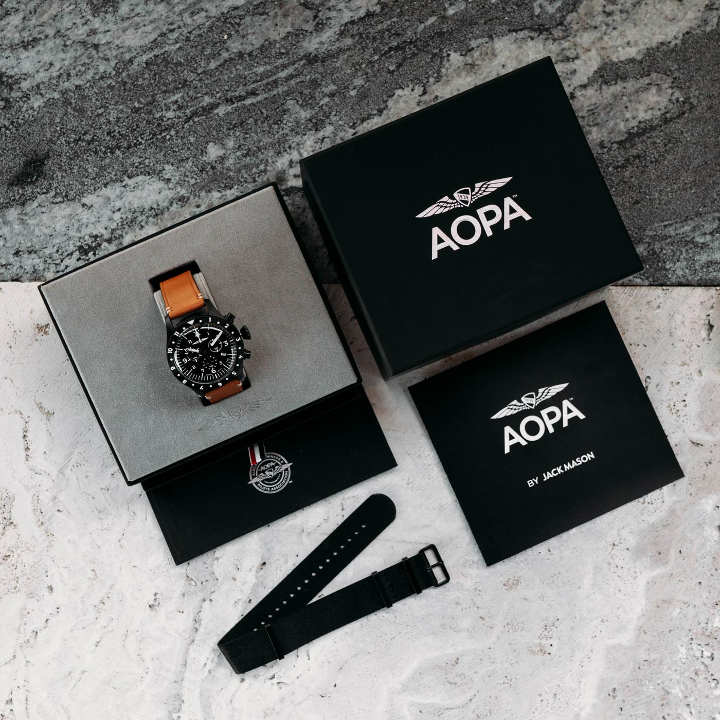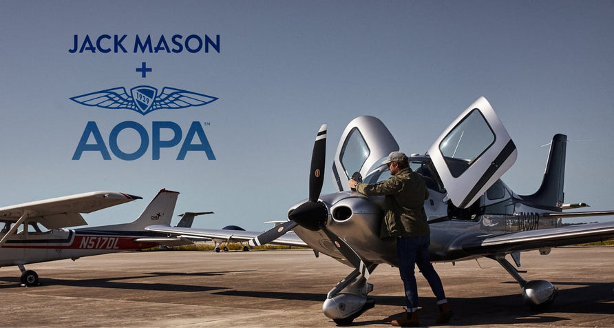 The AOPA Pilot's Chronograph is the perfect collaboration between Jack Mason's passion for watchmaking and AOPA's passion for the skies. For the first time ever, we introduce tritium markers and hands so the dial always stays lit inside a dark cockpit. The case is sized at 45mm and coated with a PVD process for maximum durability and wear resistance. We outfitted the watch with a Swiss Ronda Caliber 5030.D chronograph movement that's protected by an anti-magnetic movement guard; essential for cockpit use. The crystal is made of acrylic to allow flexibility during pressure and altitude changes during flight. The AOPA Pilot's Chronograph is tested for water resistance of up to 100 meters.