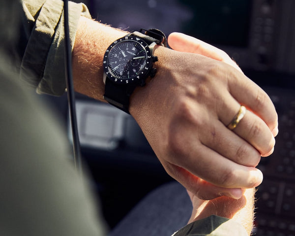 Equipped with a Ronda Caliber 5030.D chronograph movement, this watch is the perfect tool for tracking total flight time or orienteering. The Swiss quartz movement can track elapsed time up to 12 hours.