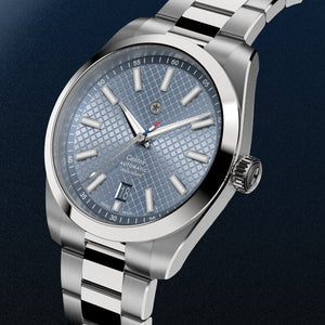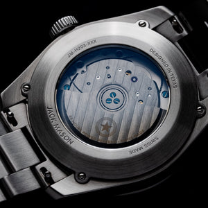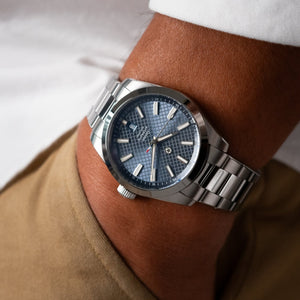 The Canton was designed to be the perfect everyday watch and marks Jack Mason’s first Swiss made watch. Featuring a La Joux Perret G100 movement that boasts 68 hours of power reserve, the  Canton is packed with performance features a daily commuter would need in any environment. The case measures 39mm in width and 46mm lug to lug, making it the absolute perfect size for any wrist. The Canton features a unique waffle textured dial with a beautiful sunray finish to add depth and visual interest. The slate color appears light blue in most lighting conditions but will also change to a grey tone in other lighting. To meet the needs of the daily grind, a scratch resistant coating has been added to the  bracelet in addition to a micro-adjusting bracelet clasp.
