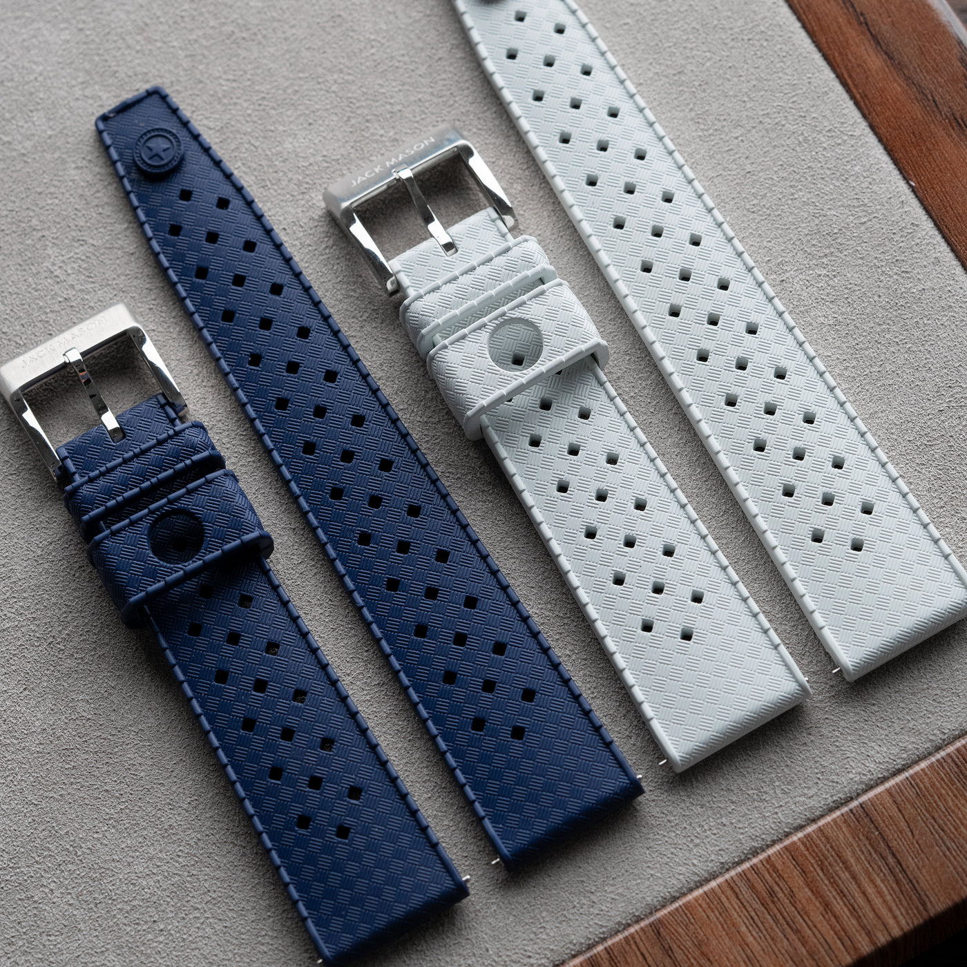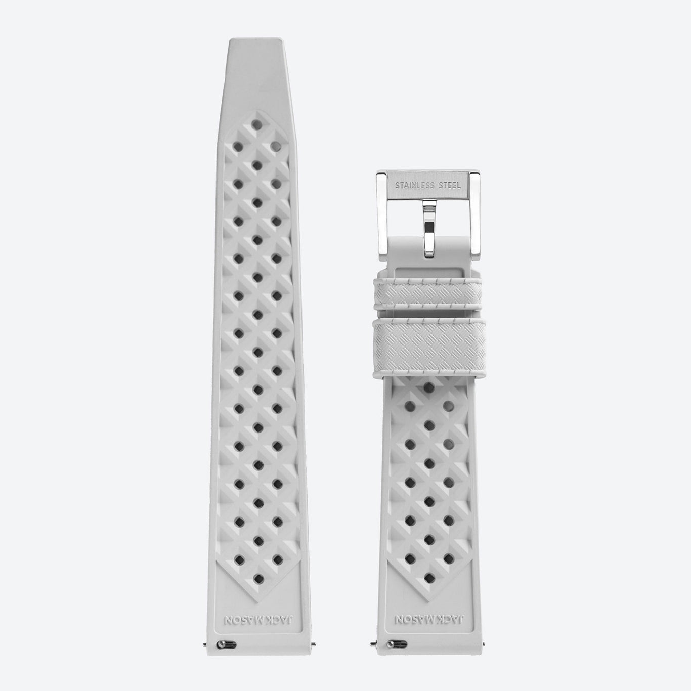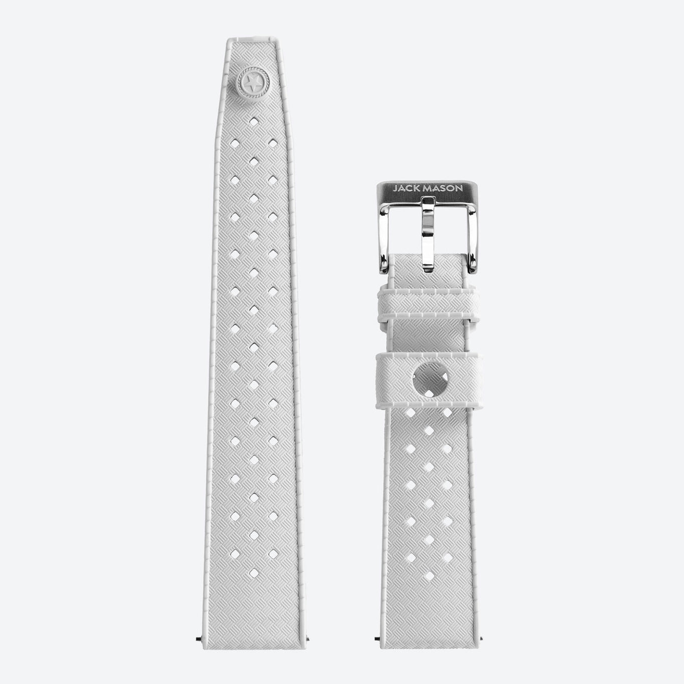 The Jack Mason 20mm tropic strap has additional custom features typically unseen in anywhere else. The each keeper has a locking mechanism molded into the form to make sure you never have to worry about the strap tip sticking out. The FKM material gives this rubbery strap a luxury feel that's not too flimsy or too stiff, and performs perfectly in the water. The Jack Mason tropic strap is equipped with quick release pins for tool less strap interchangeability.