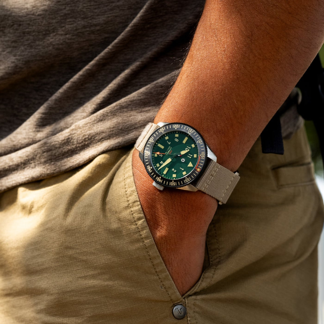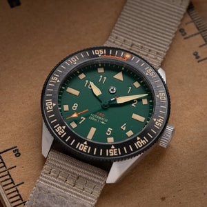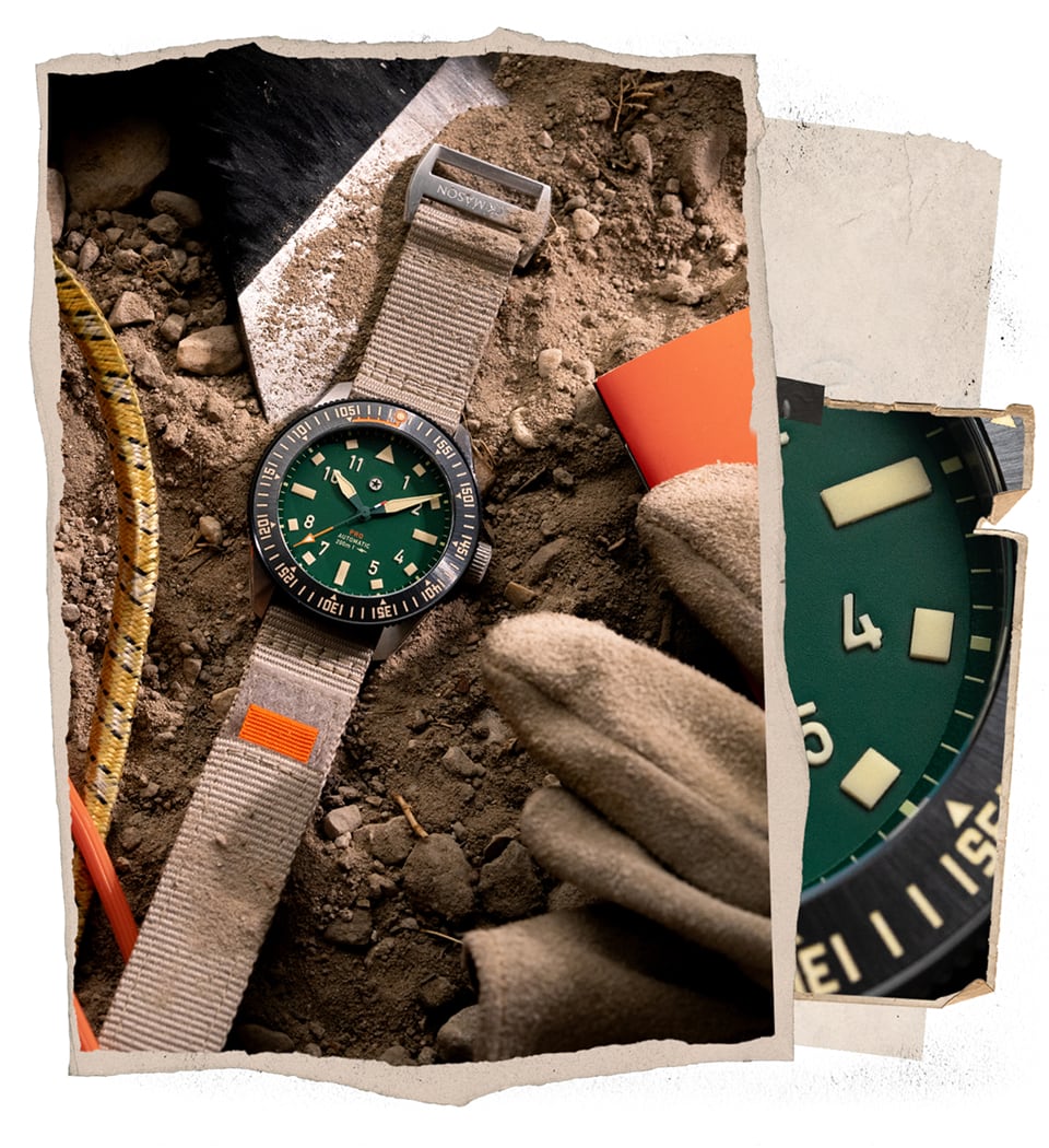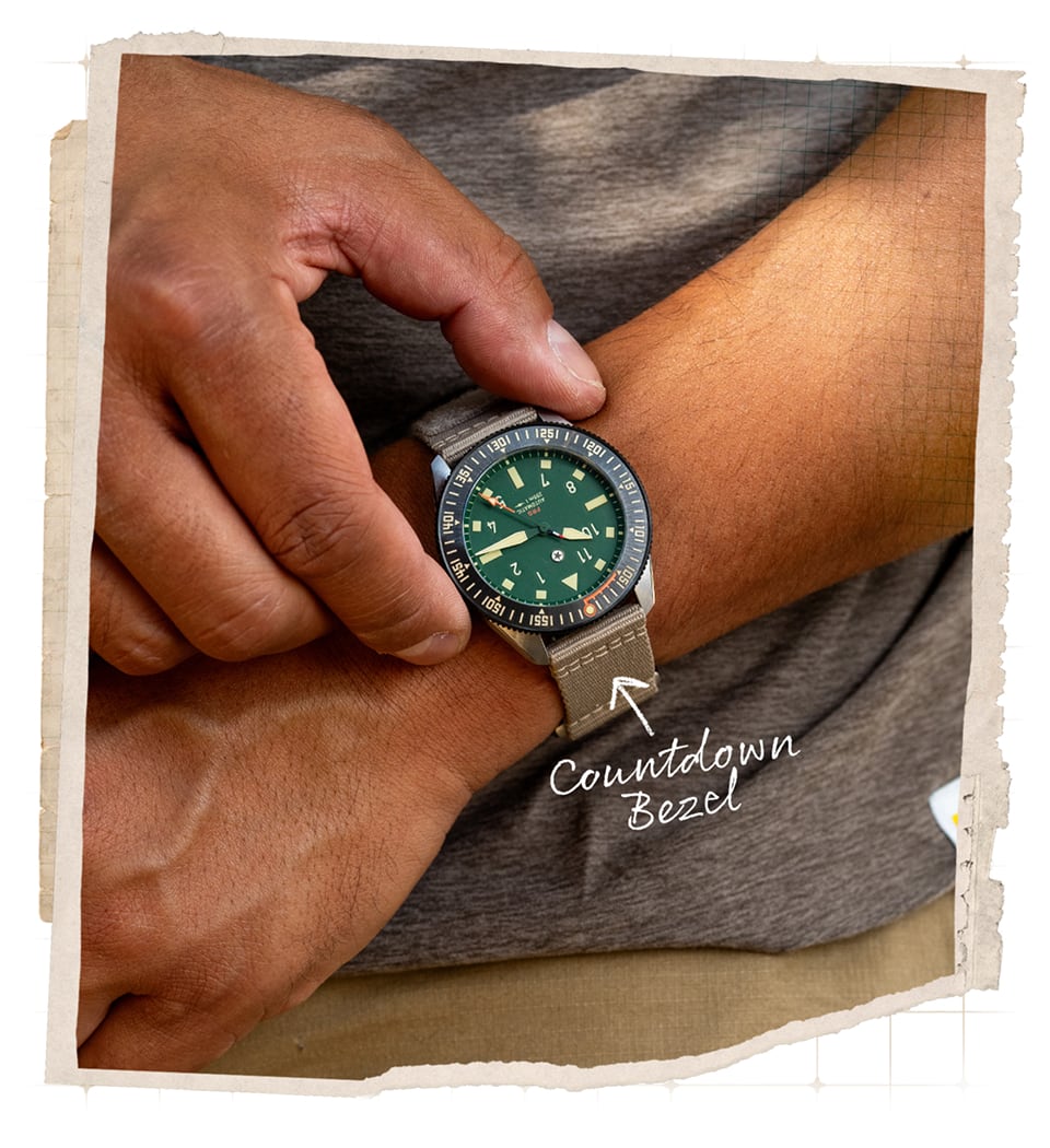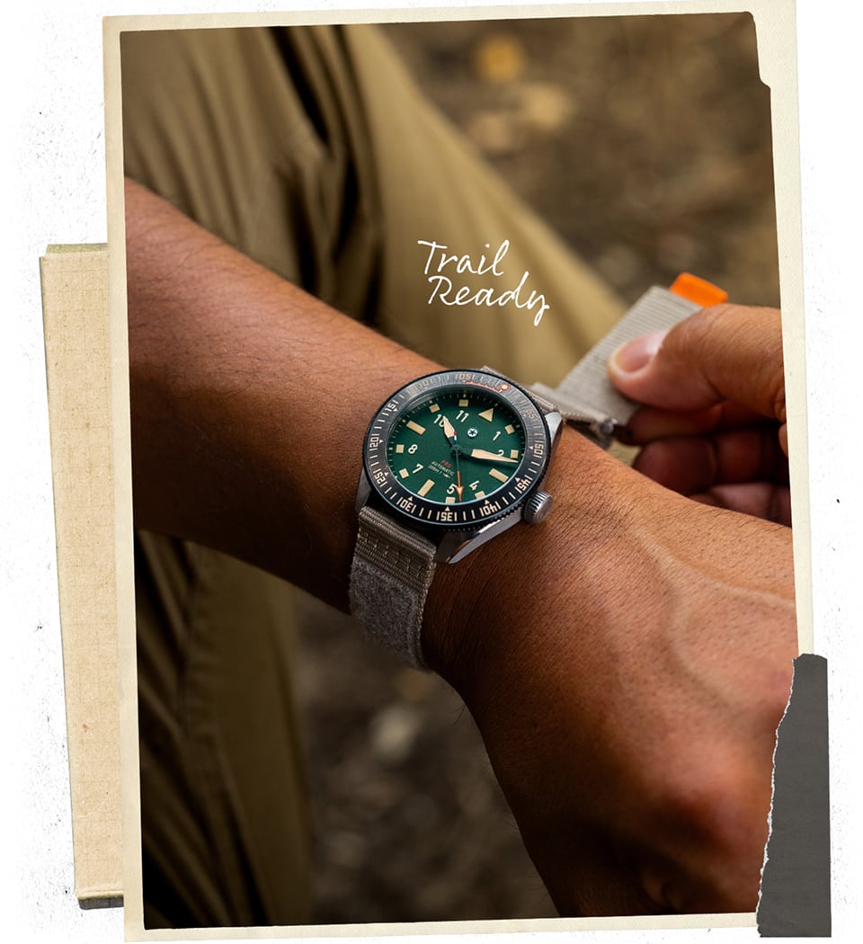 The Pursuit Pro is seriously built for the adventurer. Inspired by the trails, the rivers, and sportsmen, the Pursuit Pro is a multipurpose tool watch at the highest level. The 120-click bi-directional bezel features a bezel guard designed to protect the ceramic insert from chipping. It also features a countdown bezel in Swiss SuperLumiNova to ensure visibility during those early morning hikes before sunrise.
