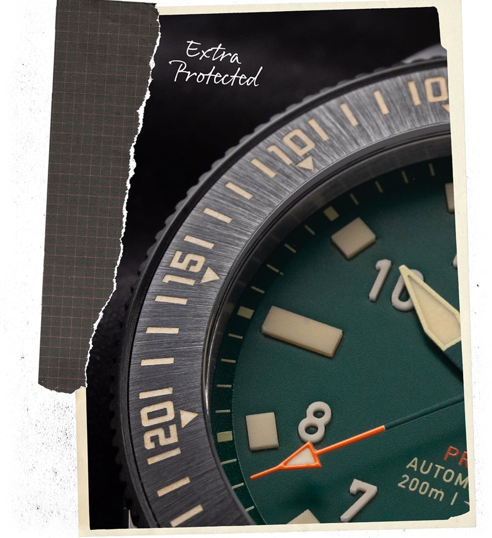 In rough, unpredictable environments you have to be prepared for anything. To protect the ceramic bezel insert from inevitable bumps, the bezel grip extends up over the edge of the ceramic insert and keeps it out of harm’s way. All function. No fuss.