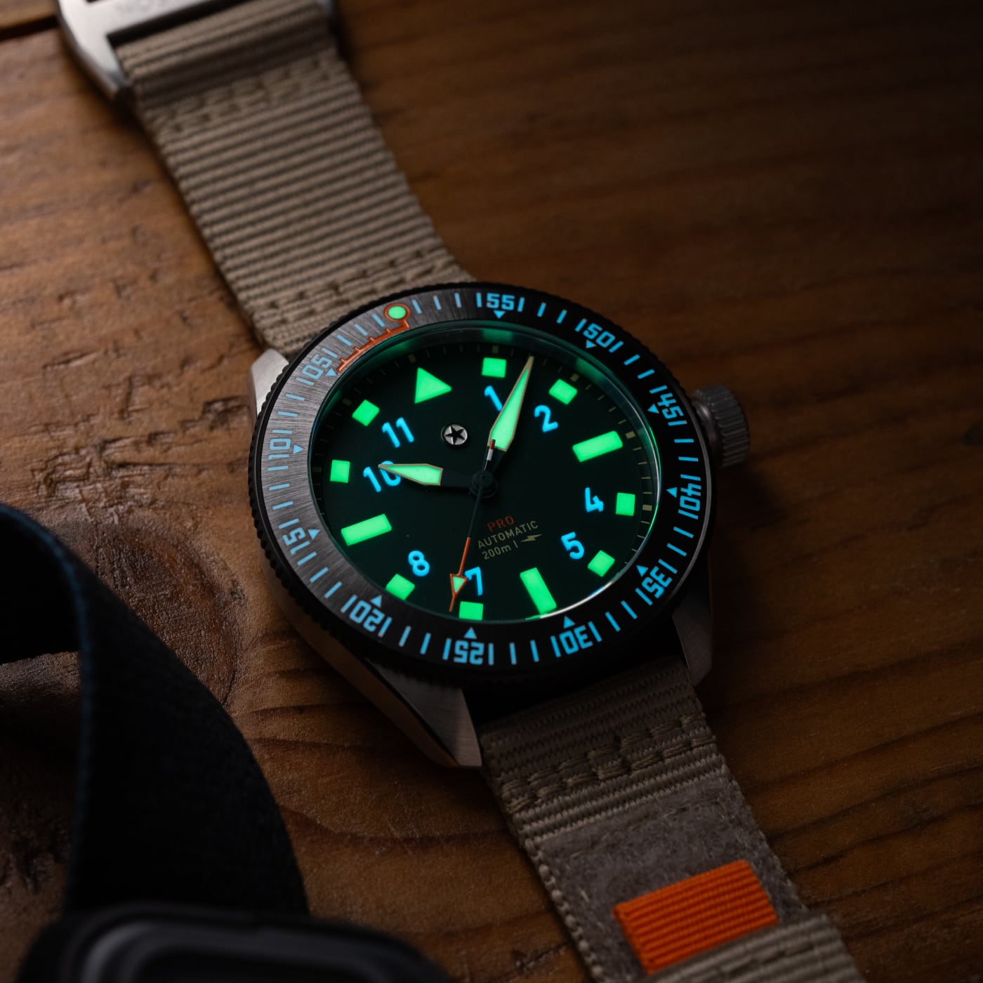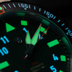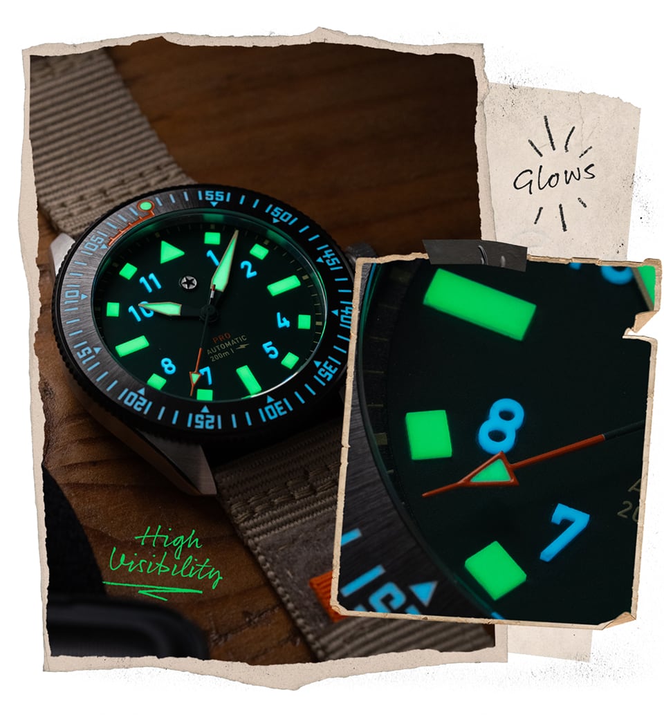 The dial has a matte finish and the legibility is great enhanced by solid forms of Lumicast® made with SuperLumiNova Grade X2 which boasts up to 87% performance enhancement over Grade X1. Inside, the Pursuit Pro is powered by a Swiss Made La Joux Perret G101 movement that is regulated in-house to +/-5 seconds per day, which is further protected by an anti-magnetic cage to maintain accuracy. With water resistance up to 200m, the Pursuit Pro is ready to take on any adventure.