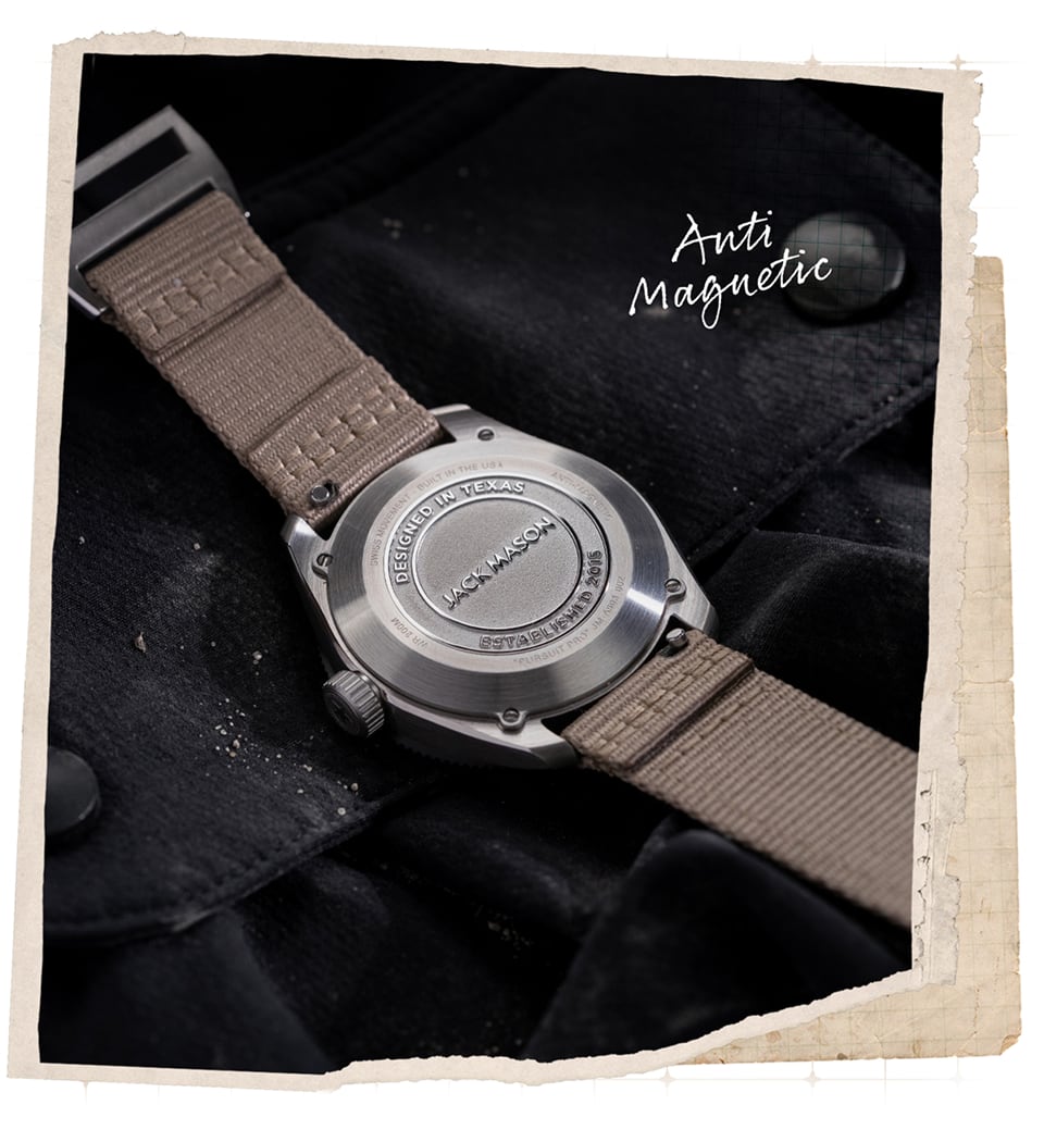 Every Pursuit Pro is regulated to +/-5 seconds per day by in-house technicians because, in the wild, time is your most important tool. To protect the movement’s accuracy from the potentially harmful magnetic fields from power banks, flashlights, and other outdoor gear, it’s housed in a soft-iron cage. The anti-magnetic movement cage safeguards the watch from magnetic fields of up to 4,800 A/m (roughly 60 Gauss).