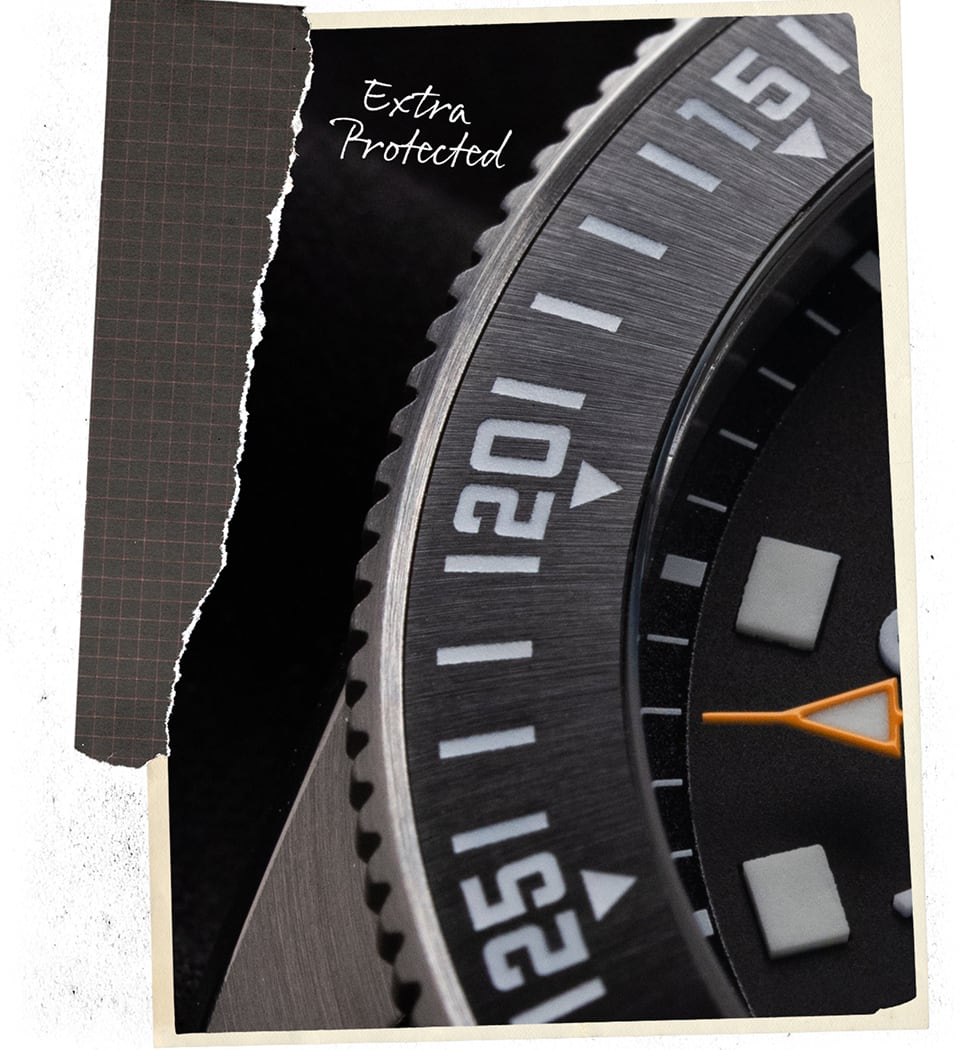 In rough, unpredictable environments you have to be prepared for anything. To protect the ceramic bezel insert from inevitable bumps, the bezel grip extends up over the edge of the ceramic insert and keeps it out of harm’s way. All function. No fuss.