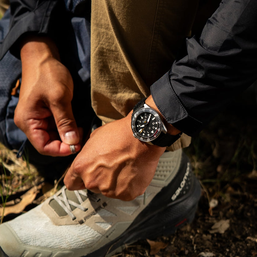 The Pursuit Pro is seriously built for the adventurer. Inspired by the trails, the rivers, and sportsmen, the Pursuit Pro is a multipurpose tool watch at the highest level. The 120-click bi-directional bezel features a bezel guard designed to protect the ceramic insert from chipping. It also features a countdown bezel in Swiss SuperLumiNova to ensure visibility during those early morning hikes before sunrise.