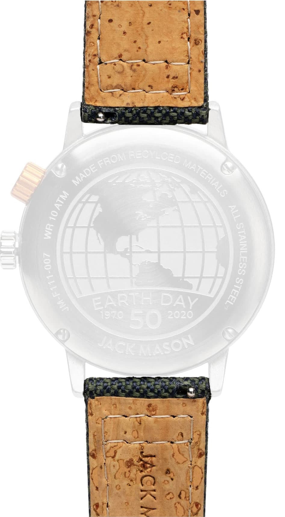 The Solar watch features a cast recycled stainless steel case that is assembled and tested for water- resistance of up to 100 meters. The solar-powered movement sits below a dark green perforated dial and can last up to 6 months on a full charge. The 20mm polyester strap, made from recycled PET and sustainable cork.