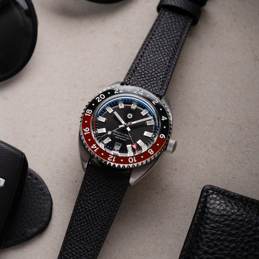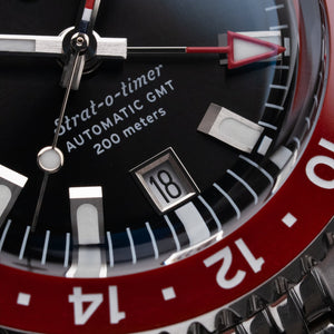 The Strat-o-timer GMT celebrates one of the most iconic watches in history. Housing the Miyota 9075 automatic GMT movement, the Strat-o-timer features jump hour hand making it a traveler's GMT. The bezel features a two-piece ceramic construction that includes two separate colors, making this an engineering feat. With a vision of becoming a legacy brand in our home state of Texas, the Strat-o-timer is assembled, and the movement regulated, in the USA.