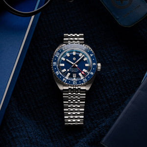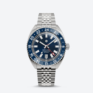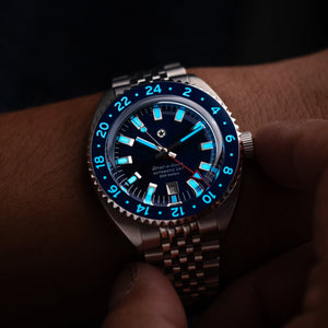 The mechanical, self-winding Miyota 9075 movement allows for accurately tracking two different timezones simultaneously. The traveler GMT functionality grants the ability to adjust the local time via the crown without affecting the 24 hour hand or stopping the watch. Every movement is regulated in-house to maintain an accuracy tolerance of +/-5 seconds per day.