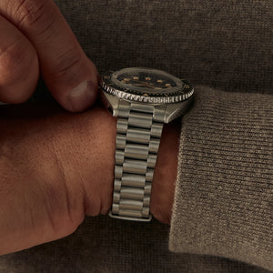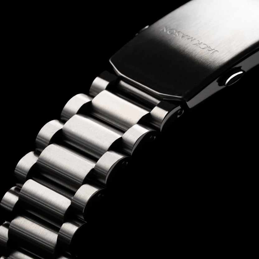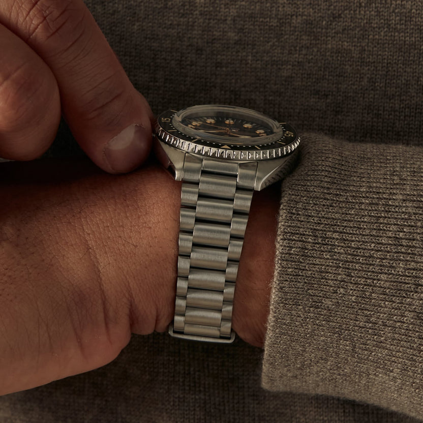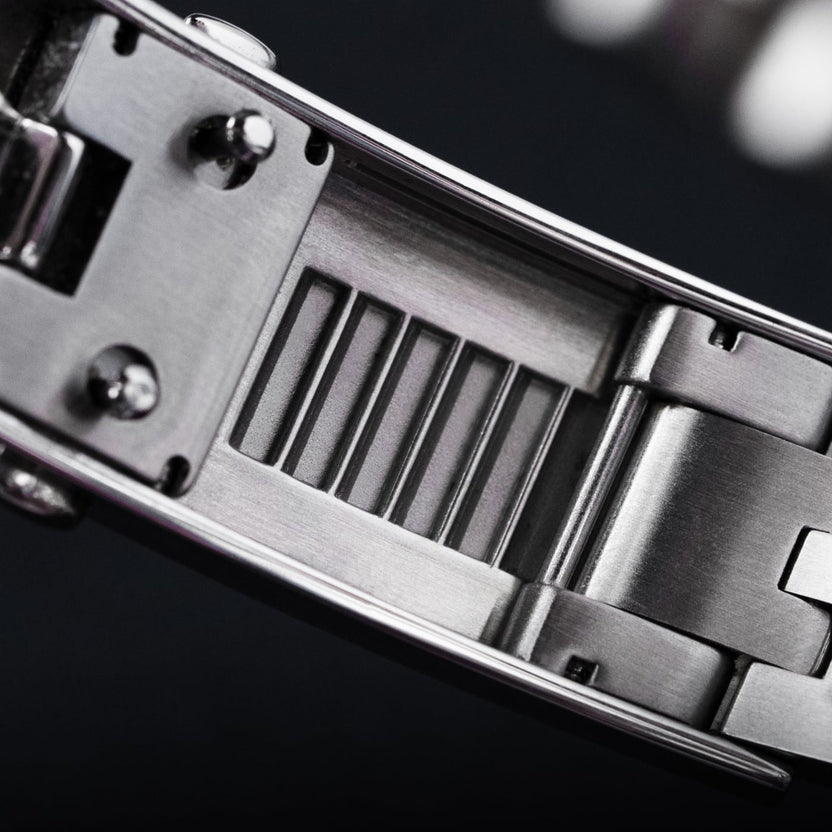 The 316L stainless steel bracelet features a concealed, tool-free system for on-the-go micro-adjustments. The clasp has been carefully engineered with 9 levels of fine-tuning to ensure the perfect fit on a broad spectrum of wrist sizes. While being worn, all the clasp’s mechanics stay hidden out of view to preserve the bracelet’s refined and uniform look.